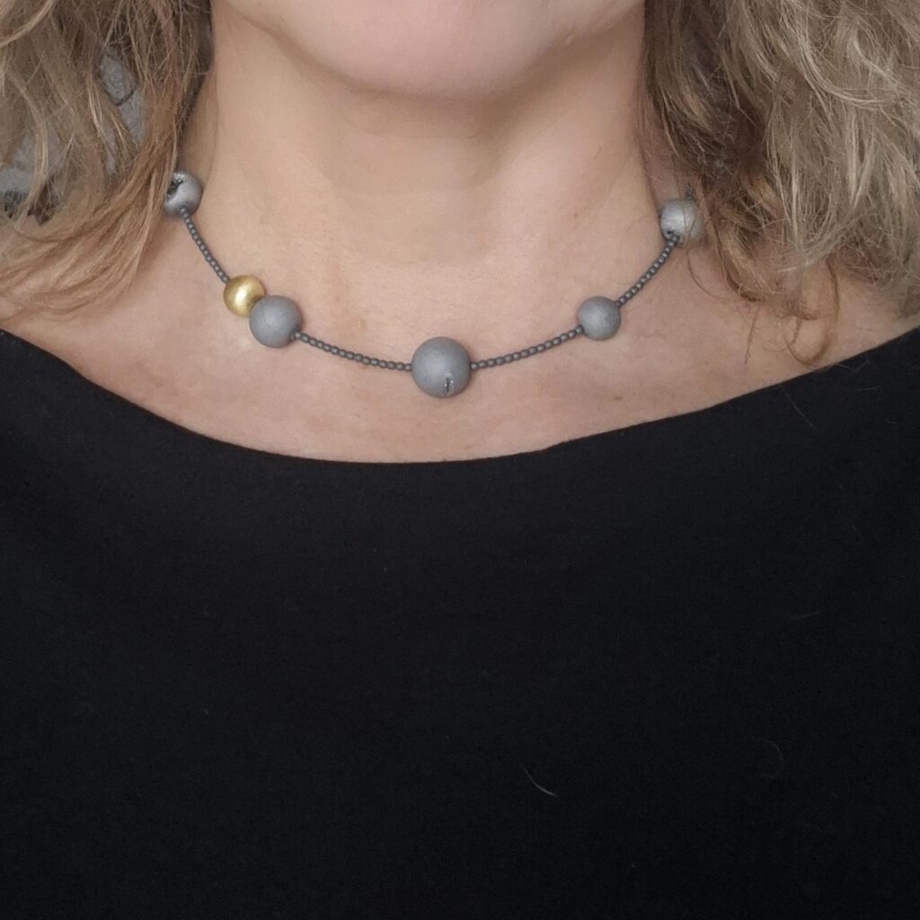 Dla miłośniczek bardziej wyrazistej biżuterii idealny będzie naszyjnik z większymi, matowymi kulkami hematytu (ostatnie zdjęcie). Pięknie prezentuje się na tle czerni i stanowi mocny, ale nadal elegancki akcent – doskonały do prostych sukienek z dekoltem łódkowym lub klasycznych golfów. Zwróć uwagę na złoty detal, który przełamuje surowość hematytu i dodaje biżuterii artystycznego charakteru.
