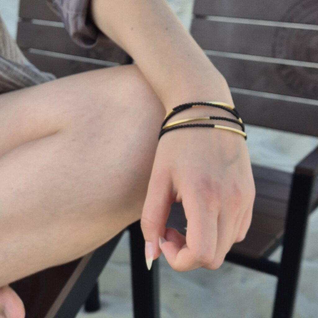 Bransoletki na cienkim, ciemnym sznurku z hematytami (trzecie zdjęcie) to z kolei doskonały wybór na luźniejsze, miejskie stylizacje. Możesz nosić je solo albo w parze – pasują do lnianej koszuli, oversize’owej marynarki czy letnich sukienek. Ich subtelność sprawia, że nie przytłaczają stylizacji, a jednocześnie przyciągają wzrok dzięki kontrastowi między ciemnym hematytem a złotem.