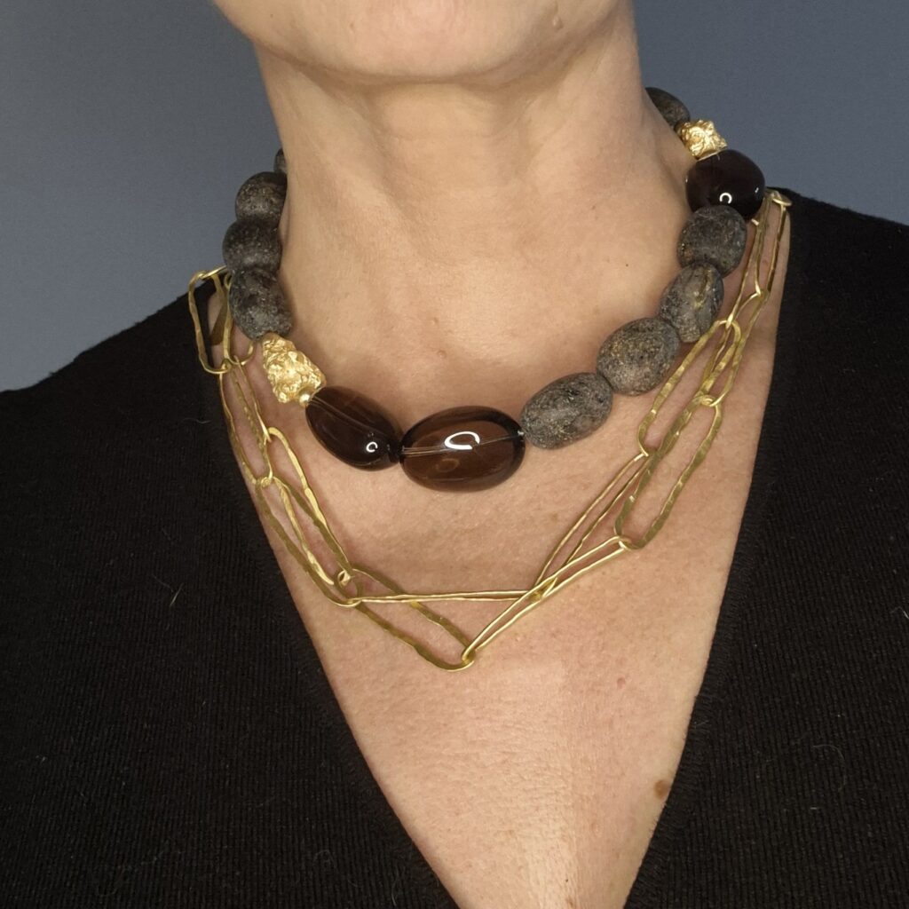 Chropowate, ciemne korale i gładkie, owalne bryły kwarcu dymnego tworzą kontrastową całość z nieregularnymi złotymi wstawkami i awangardowym łańcuchem. Noszona do czarnego dekoltu, biżuteria zyskuje głębię i dramatyzm, idealnie wpisując się w styl boho-lux lub nowoczesny minimalizm z nutą ekstrawagancji. To propozycja dla kobiet, które lubią wyróżniać się oryginalnym detalem i podkreślać swoją niezależność poprzez modę.