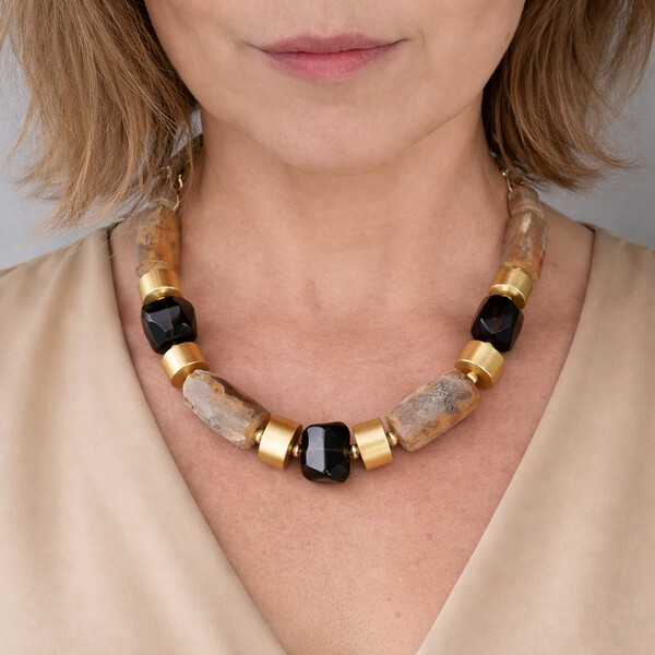 Gładka, jasnobeżowa tkanina tworzy subtelne tło dla wyrazistej kompozycji kamieni: prostokątne bursztyny o ciepłych, miodowych tonach przeplatają się z fasetowanym, głęboko ciemnym kwarcem dymnym i złotymi elementami, nadając całości szlachetnego blasku. To idealny wybór do minimalistycznych, monochromatycznych stylizacji – świetnie sprawdzi się do sukienek lub bluzek w stonowanych kolorach, gdzie biżuteria gra główną rolę.