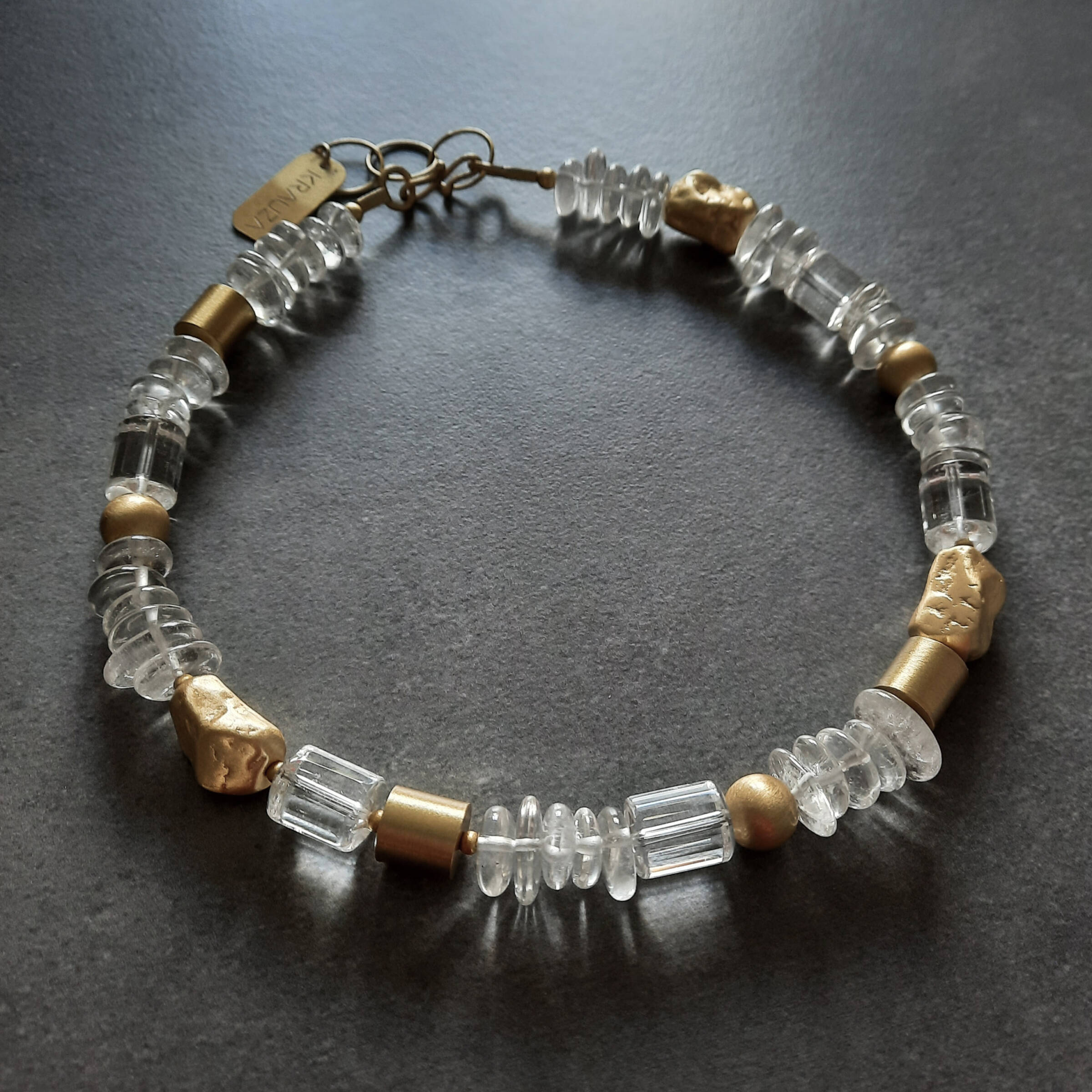 Asymetryczny naszyjnik z kryształem górskim o różnym szlifie to biżuteria dla osób, które lubią wyraziste, ale wciąż eleganckie dodatki. Przezroczysty kryształ pięknie łapie światło, a nieregularny układ kamienia nadaje całości artystyczny charakter. To pojedynczy egzemplarz – powstał jako unikatowy projekt w pracowni KRAUZA design.