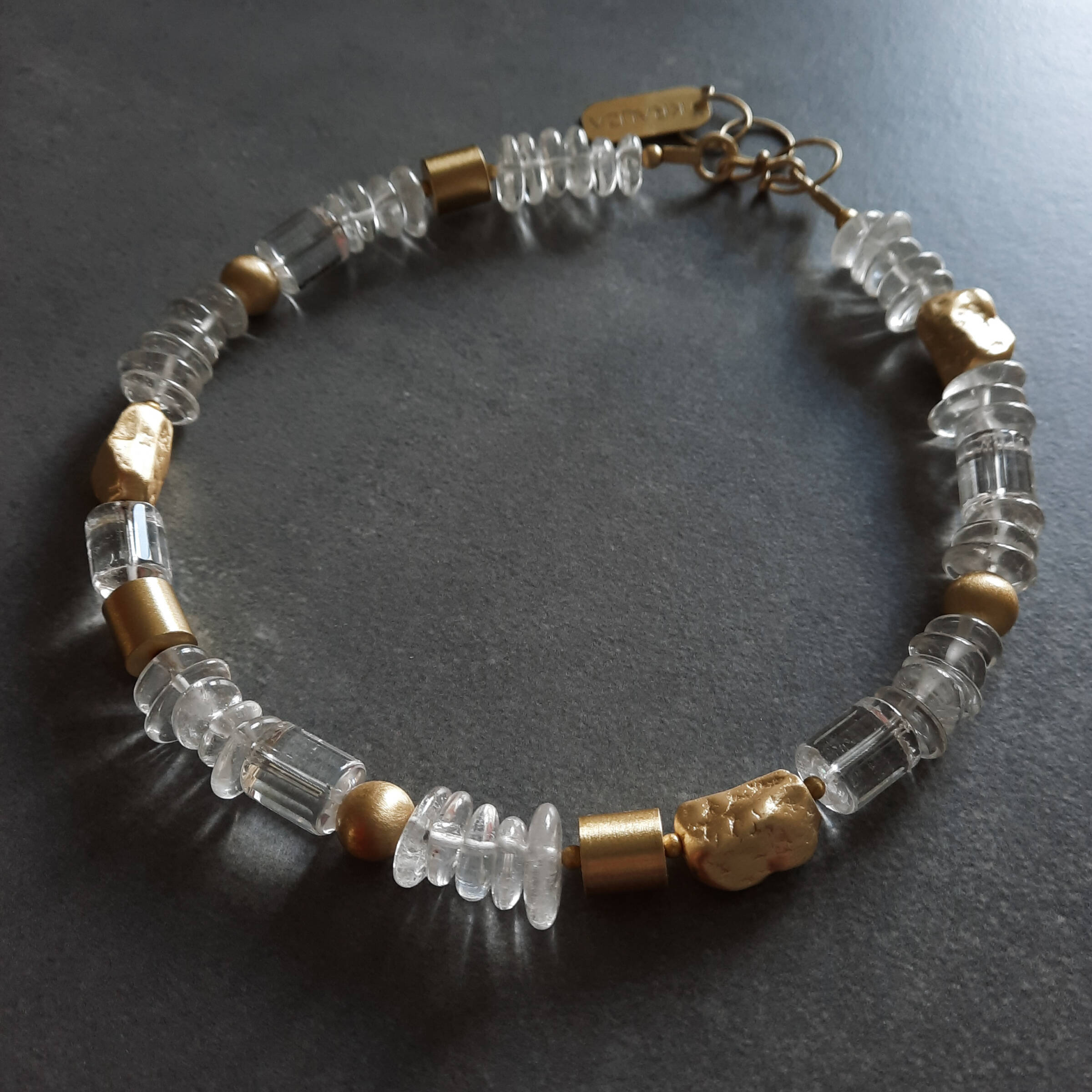 Naszyjnik powstał ze srebra próby 925, pokrytego powłoką w kolorze złota nakładaną metodą elektroforezy. Zastosowany kryształ górski ma różne szlify, dzięki czemu pięknie pracuje w świetle i podkreśla unikatowy charakter projektu.