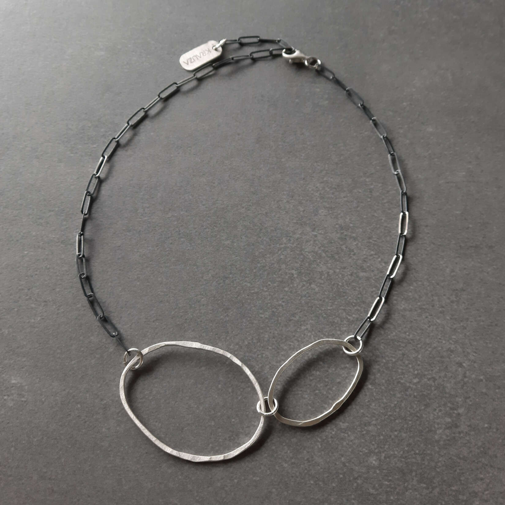 Naszyjnik w całości powstał ze srebra próby 925. Łańcuszek jest celowo przyciemniony poprzez oksydowanie, natomiast owalne elementy pozostają w naturalnym, jasnym odcieniu srebra i mają szczotkowaną, matową powierzchnię, która podkreśla ich rzeźbiarską formę.
