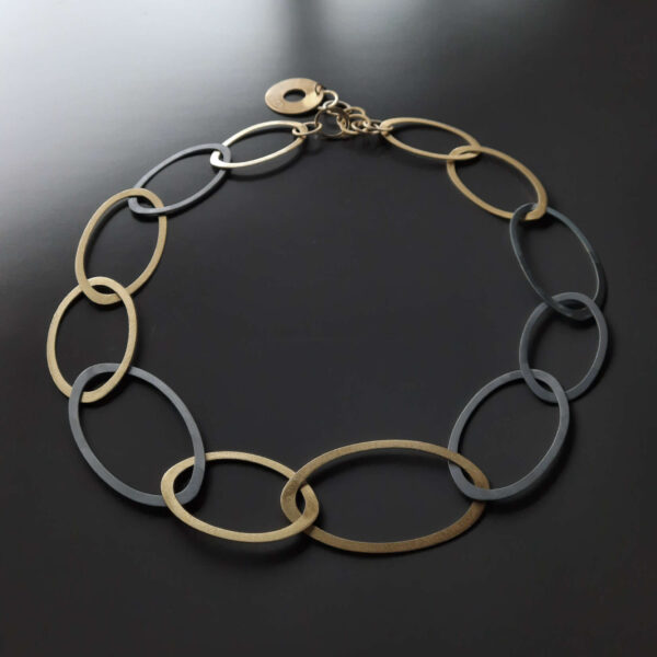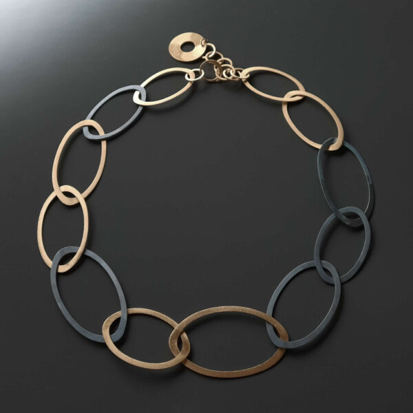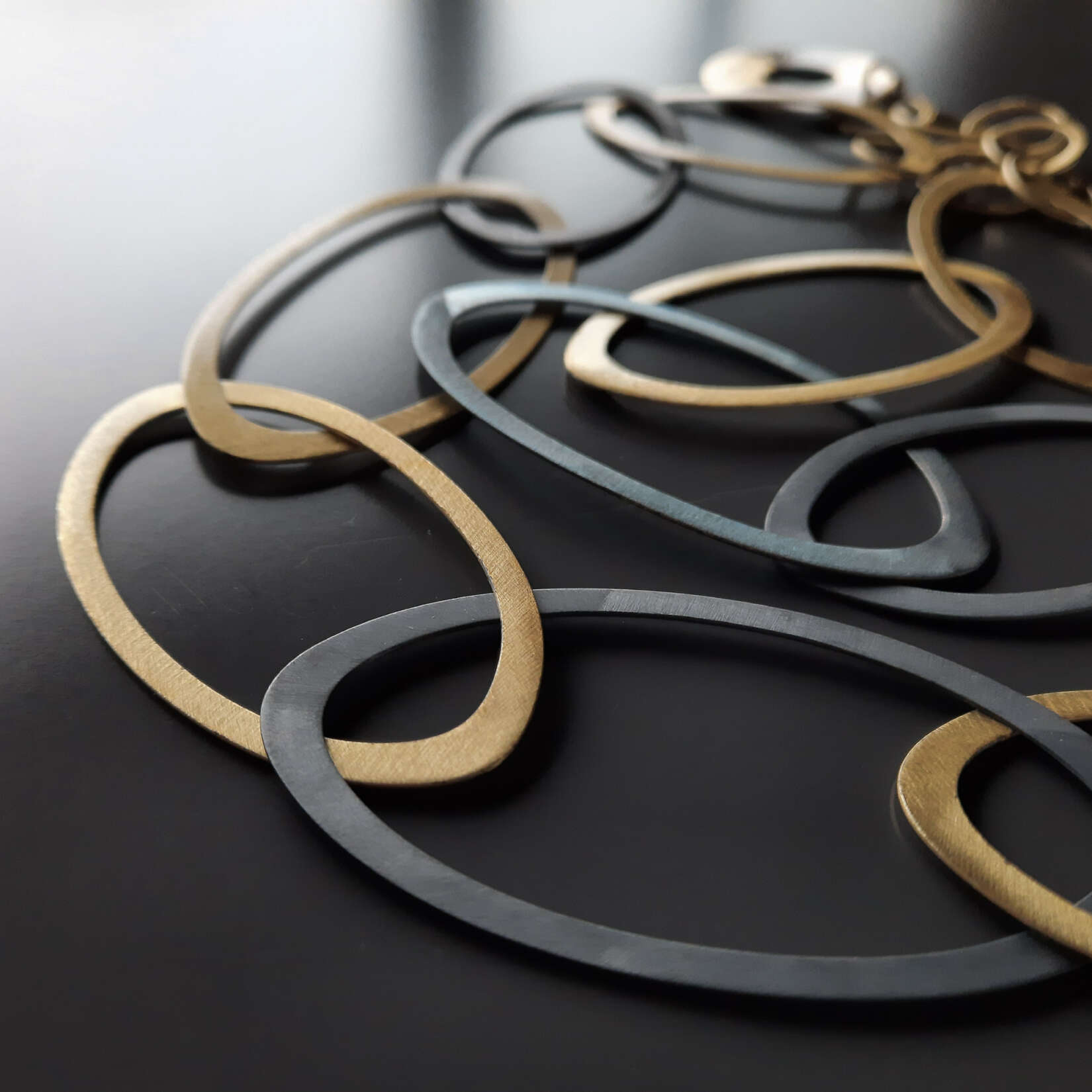 Naszyjnik wykonany jest ręcznie ze srebra próby 925. Złoty kolor uzyskujemy dzięki powłoce nakładanej metodą elektroforezy, natomiast ciemniejsze fragmenty to efekt oksydowania srebra, który nadaje całości wyrazisty, graficzny charakter.