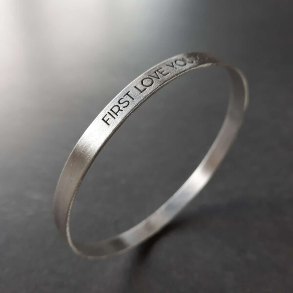 Bransoletka wykonana jest ze srebra próby 925 w naturalnym kolorze. Napis FIRST LOVE YOURSELF jest trwale naniesiony na powierzchnię bransoletki.