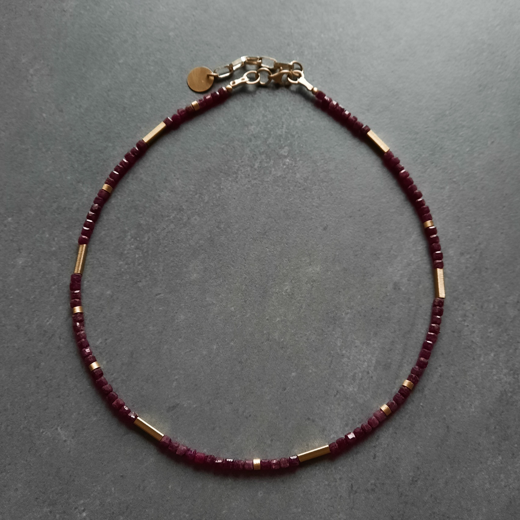 To choker z rubinem, który sprawdzi się zarówno jako codzienna biżuteria do pracy, jak i jako delikatny akcent na uroczyste okazje. Dobrze odnajdzie się w garderobie kapsułowej – jest wystarczająco wyrazisty, by nosić go solo, a jednocześnie na tyle lekki, by łatwo łączyć go z innymi naszyjnikami.