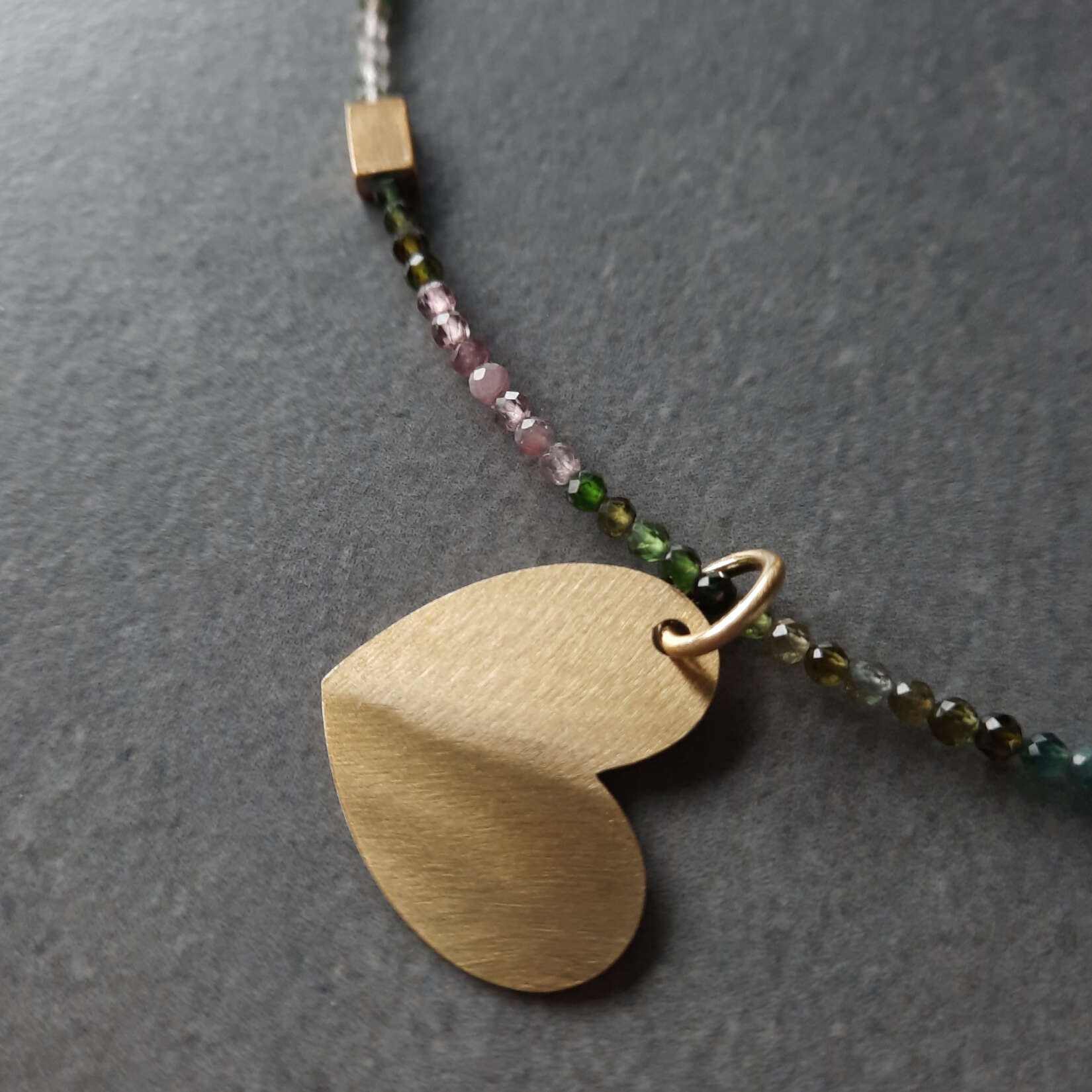 Na tle jasnych tkanin – kości słoniowej, ciepłych beży, delikatnego pudrowego różu – tęczowe turmaliny wprowadzają lekkość i odrobinę koloru, a złote serce subtelnie domyka całą kompozycję. Z granatem, grafitem czy czernią naszyjnik z serduszkiem staje się bardziej wyrazisty – barwy kamieni intensywniej odcinają się od tła, tworząc spokojny, ale zapamiętywalny akcent.
