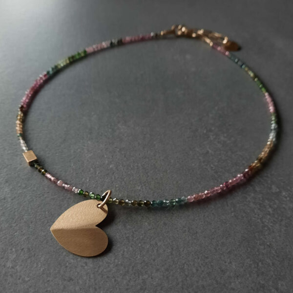 Choker z zawieszką serduszko – tęczowe turmaliny przy szyi