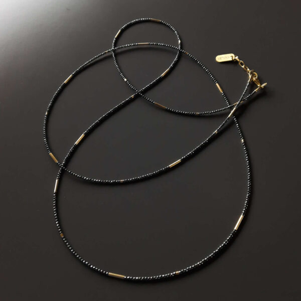 Cienki naszyjnik z hematytami – długa, graficzna linia w złotej oprawie