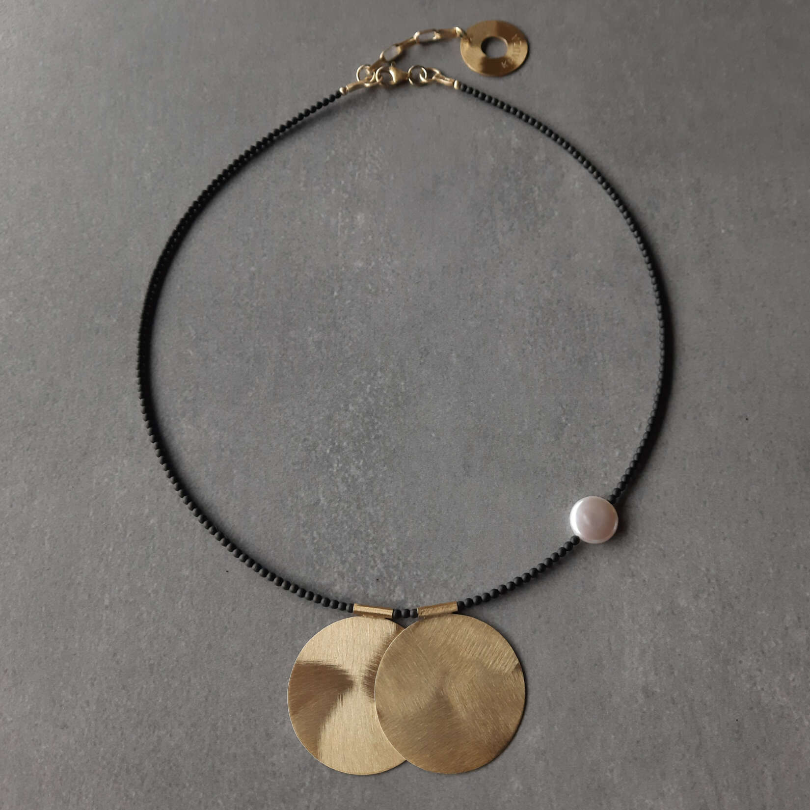 Dwa kółka na czarnych matowych hematytach ozdobione piekną perłą. Ten naszyjnik świetnie sprawdzi się do koszul i T-shirtów.