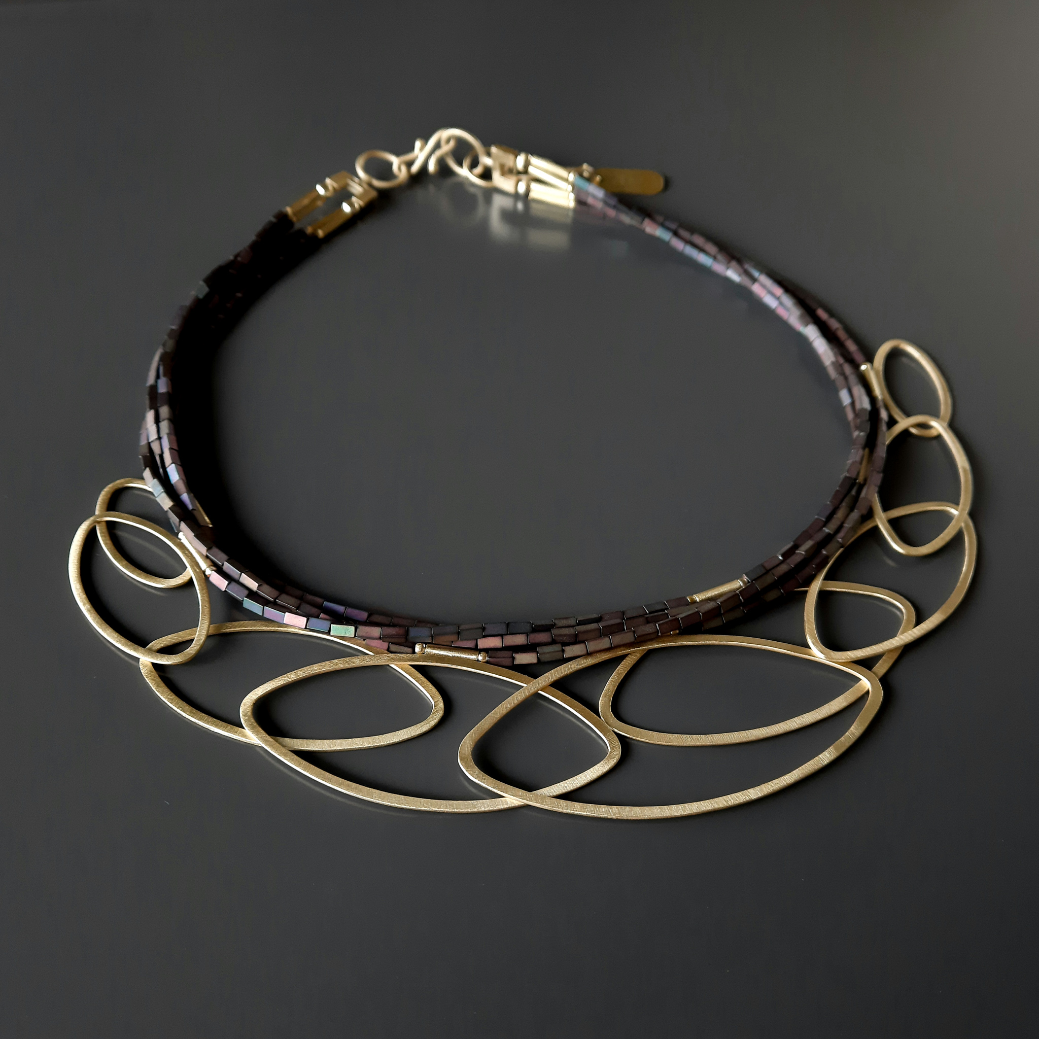 Eleganckie hematyty w odcieniach brązu, ciemnej miedzi i głębokiego fioletu połączone ze złotymi elementami w zaskakujących kształtach.
