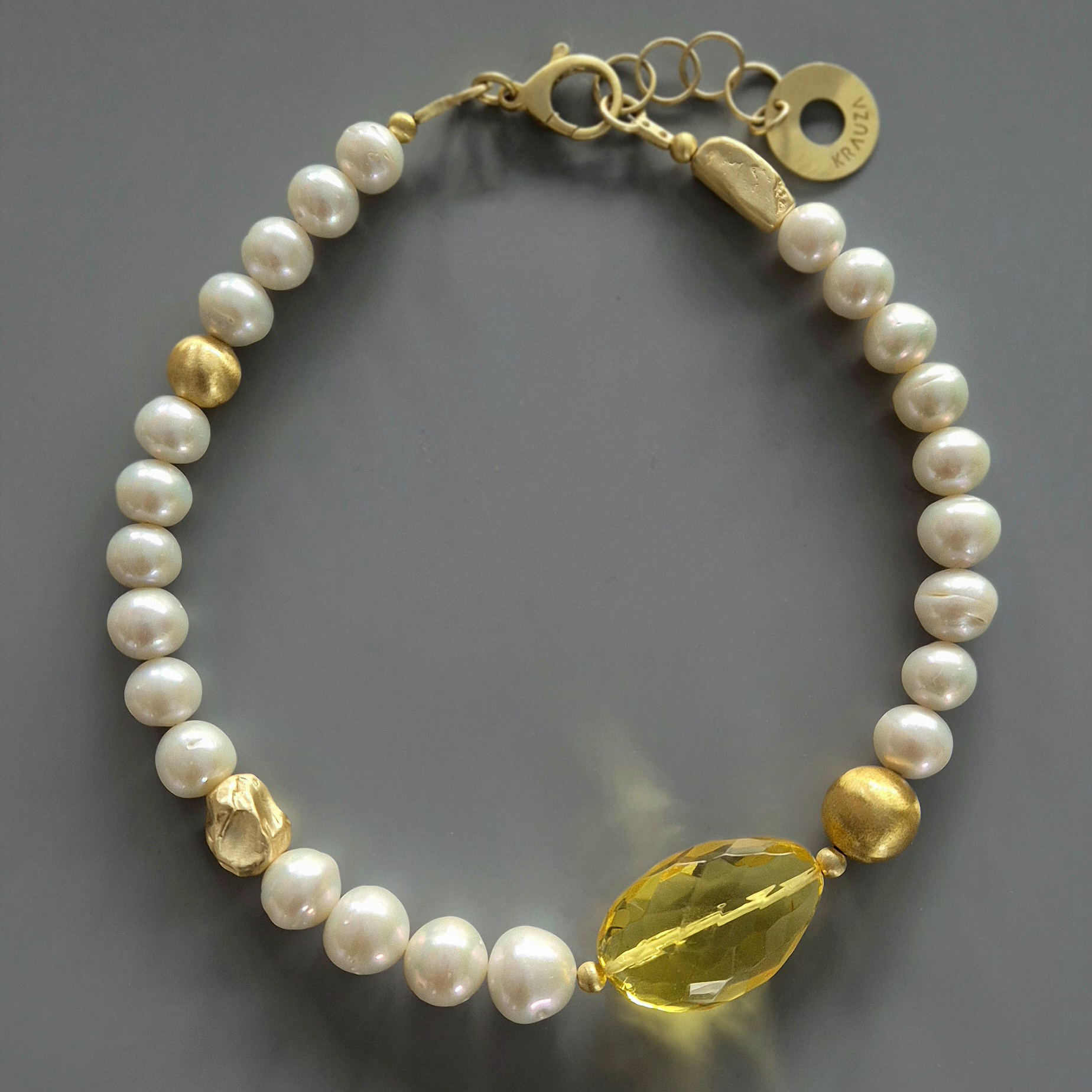 Naszyjnik Jasny bursztyn i perły wykonany jest ręcznie ze srebra próby 925. Złote elementy uzyskujemy dzięki hipoalergicznej złotej powłoce polimerowej nakładanej metodą elektroforezy, co zapewnia szlachetne, satynowe wykończenie i spójną kolorystykę z innymi modelami KRAUZA design.