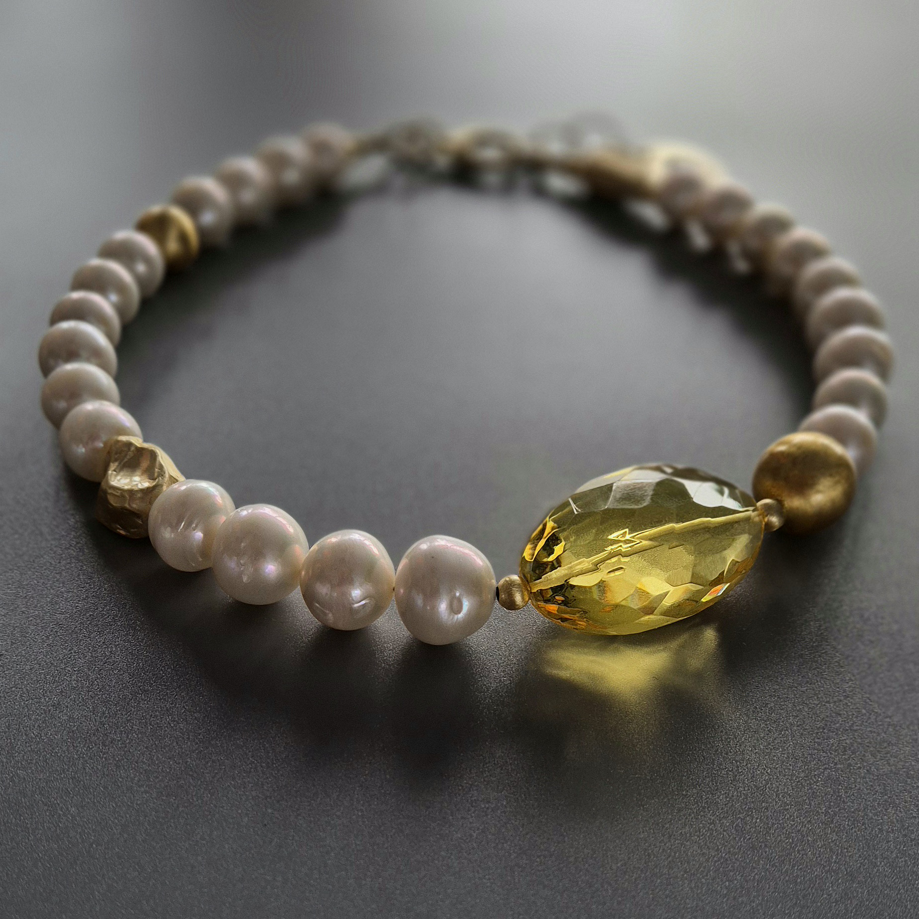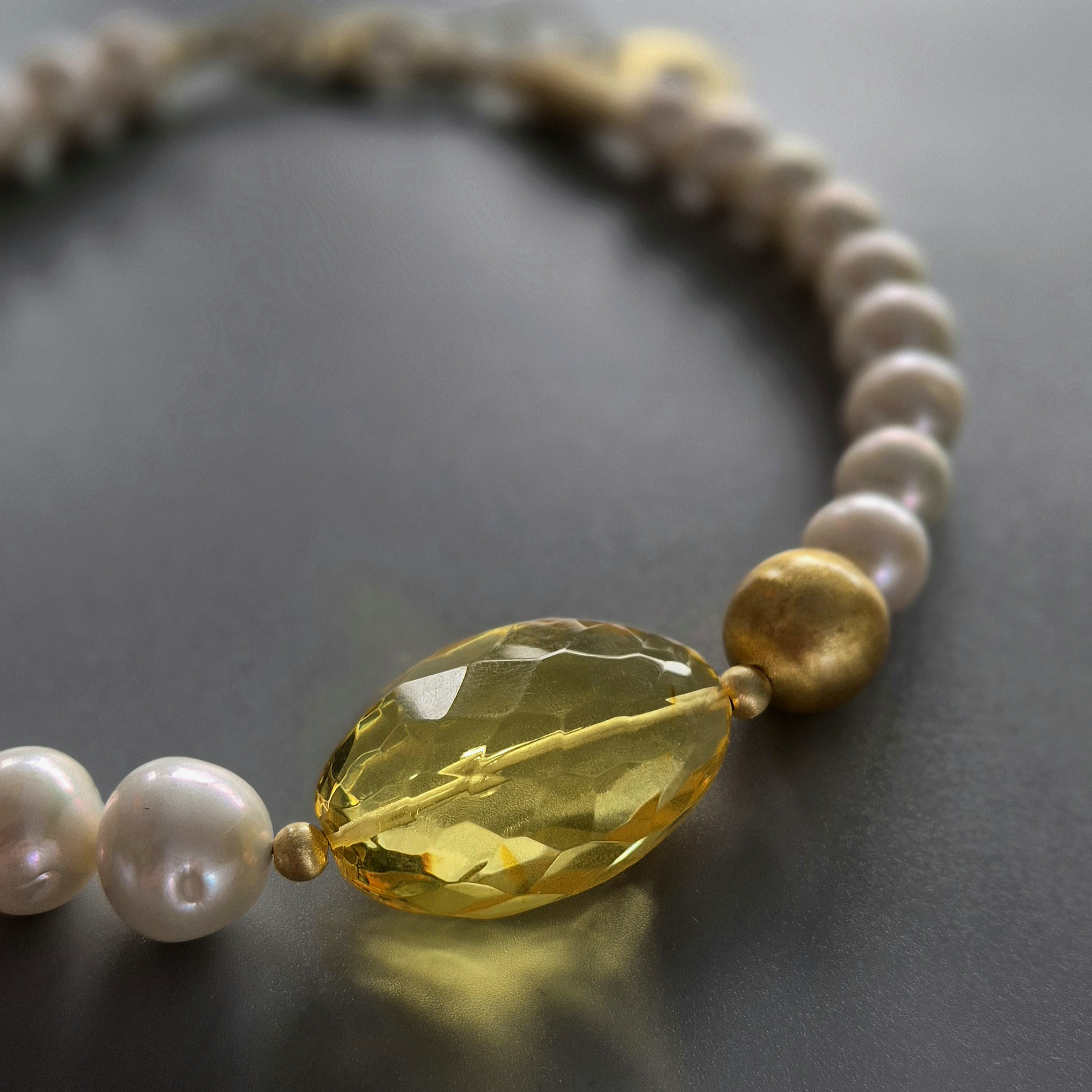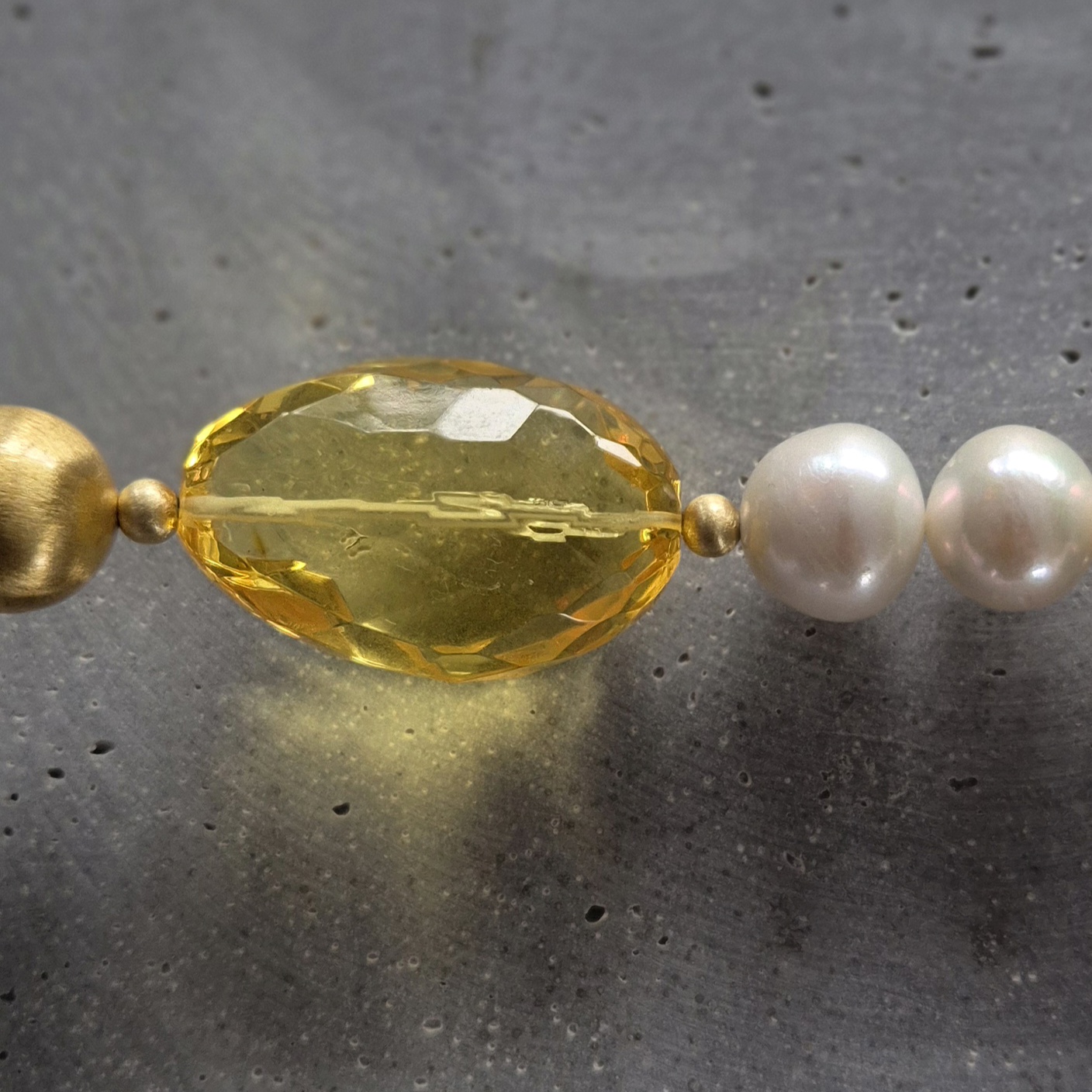 kamienie: duży fasetowany bursztyn w jasnym, cytrynowym odcieniu, nieregularne perły, złote detale ze srebra pozłacanego