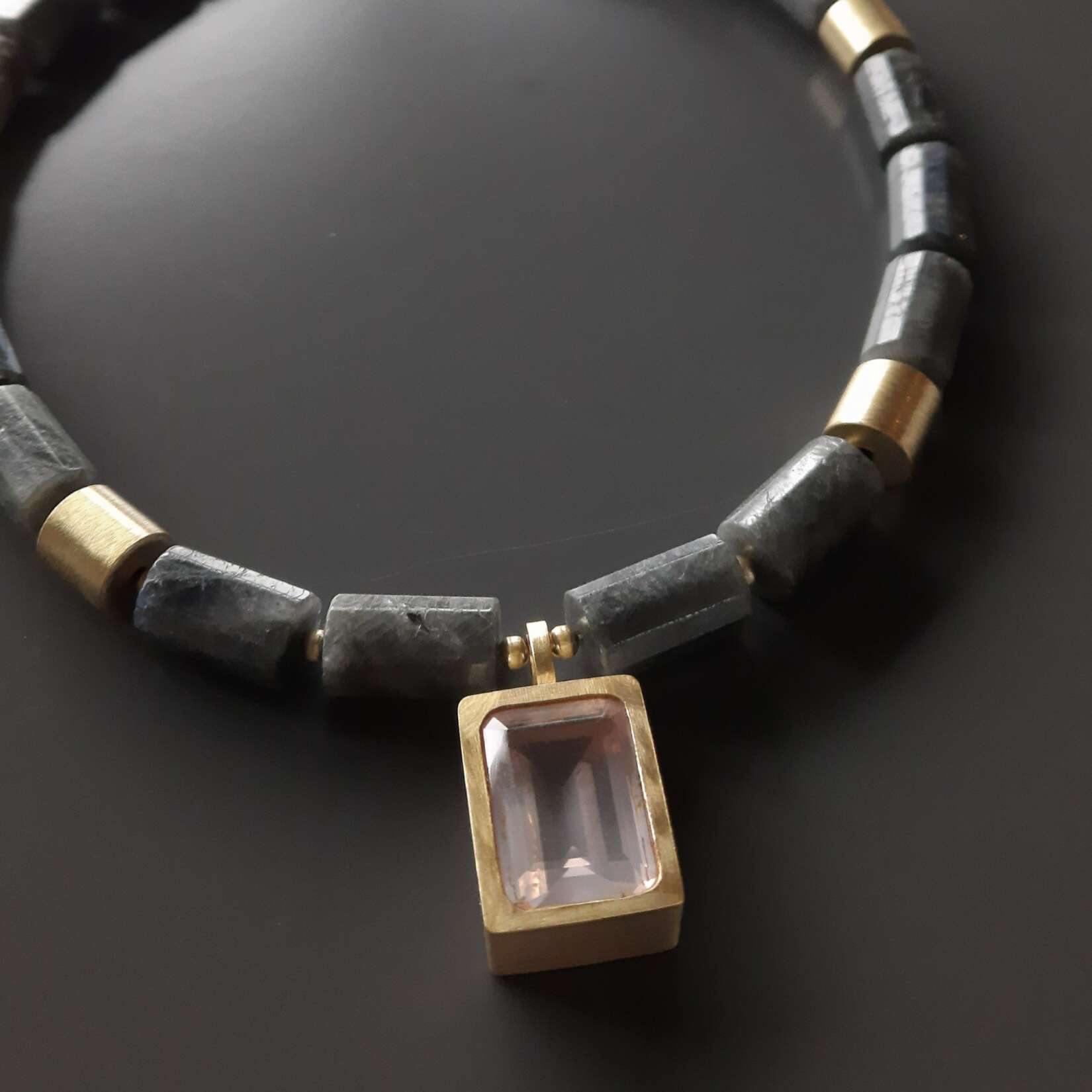 Labradoryt i kwarc różowy. Przepiękna kombinacja kamieni oraz prosta ponadczasowa forma sprawiają, że ten naszyjnik będzie pasował każdej kobiecie.