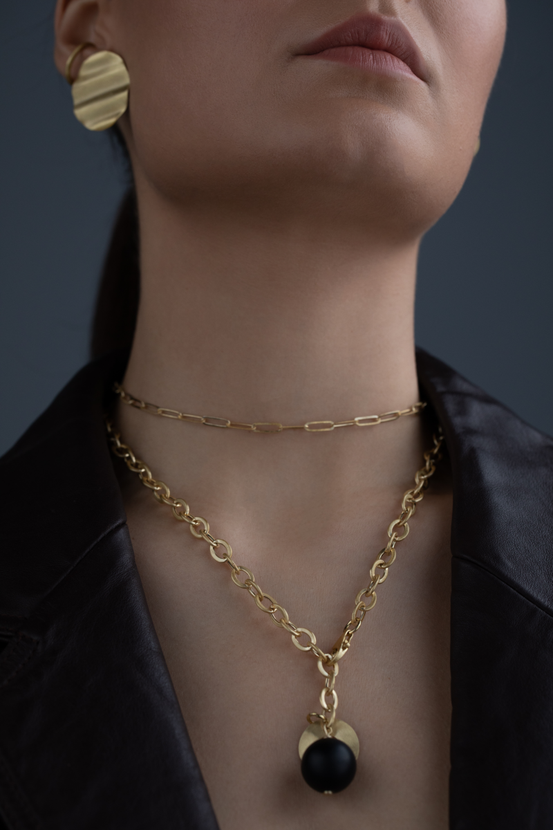 Łańcuszek z onyksem – masywny i wyrazisty. Wyjątkowy czarny onyks w matowym szlifie. To świetny początek, by skompletować swój zestaw naszyjników messy neck. Idealnie prezentuje się w towarzystwie innych łańcuszków i łańcuchów, jak również krótkich naszyjników z kamieniami.