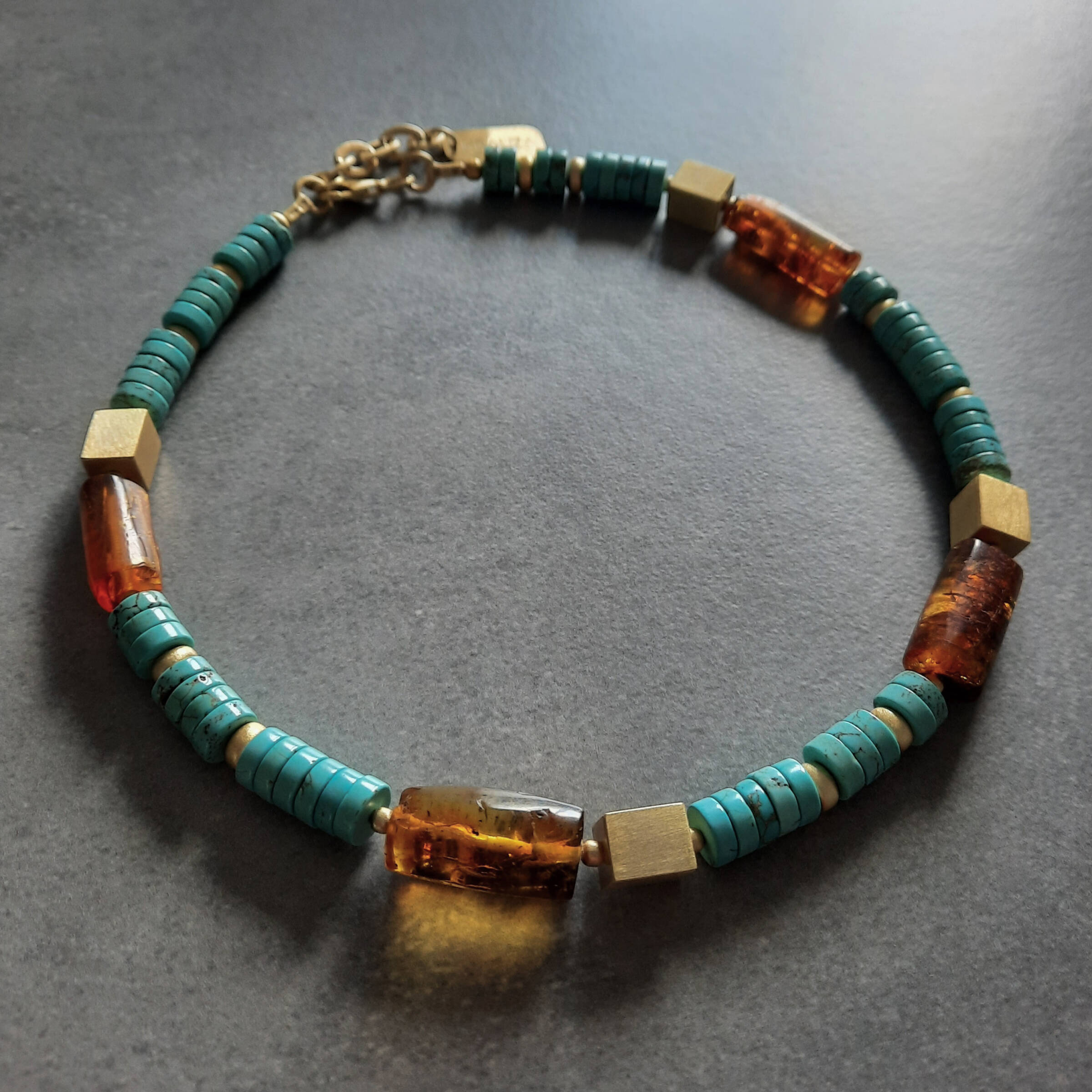 Letni naszyjnik z turkusem i bursztynem idealny na lato lub by przełamać jednobarwne stylizacje.