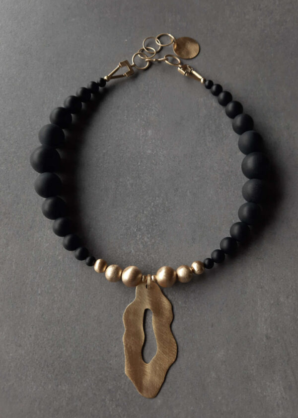 Matowe onyksy z dużym wisiorem o nieregularnych kształtach to efektowny naszyjnik idealny na kolację z przyjaciółmi lub wyjście do teatru.