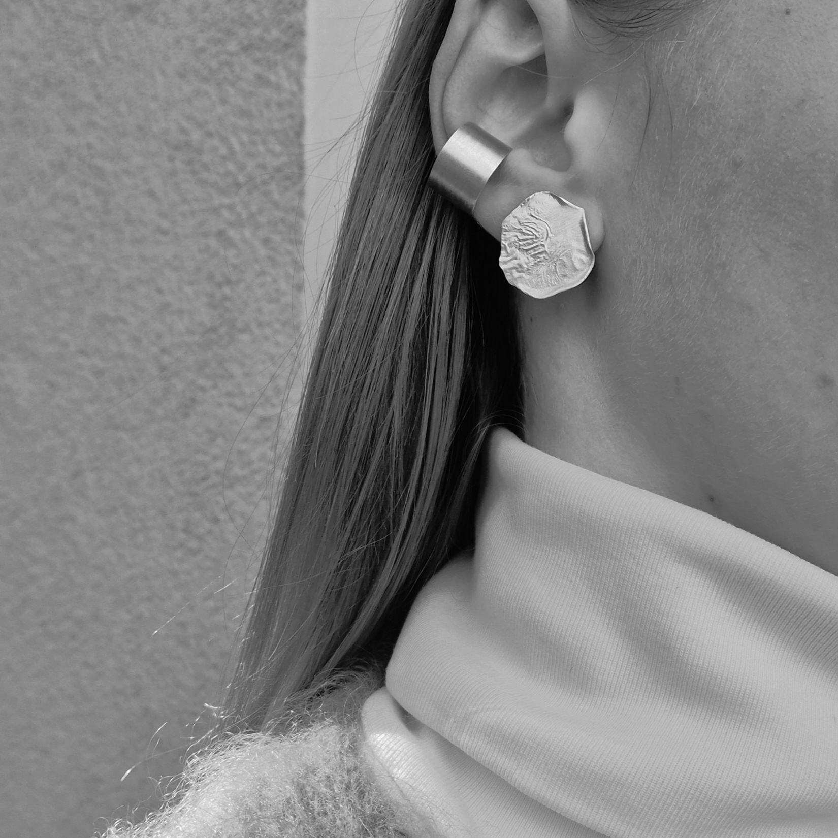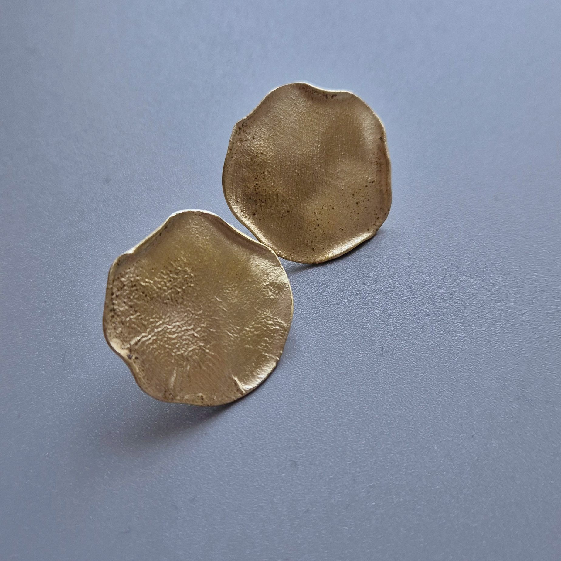 Te kolczyki to kwintesencja nowoczesnego minimalizmu w artystycznym wydaniu. Ręcznie formowane, nieregularne kolczyki sztyfty wykonane zostały ze srebra próby 925 i pozłocone w procesie elektroforezy, co nadaje im subtelny, złocisty połysk. Ich lekko asymetryczna forma sprawia, że każdy egzemplarz jest unikatowy – jednocześnie prosty i niezwykle charakterystyczny.