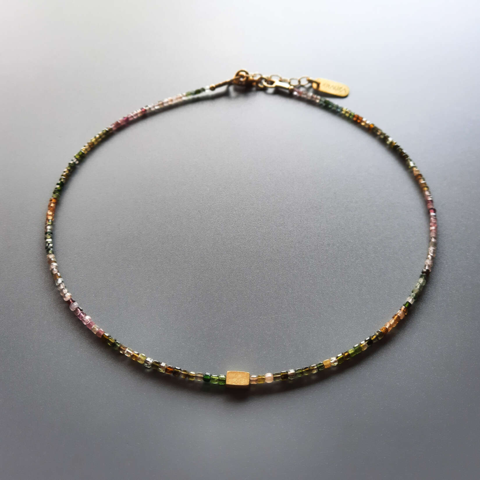 Minimalistyczny choker z delikatnym punkcikiem, wykonany z niesamowitych tęczowych turmalinów. To uniwersalny dodatek na co dzień. Kamienie są pięknie fasetowane dzięki czemu uroczo odbijają światło i ożywią nawet zwykły T-shirt.