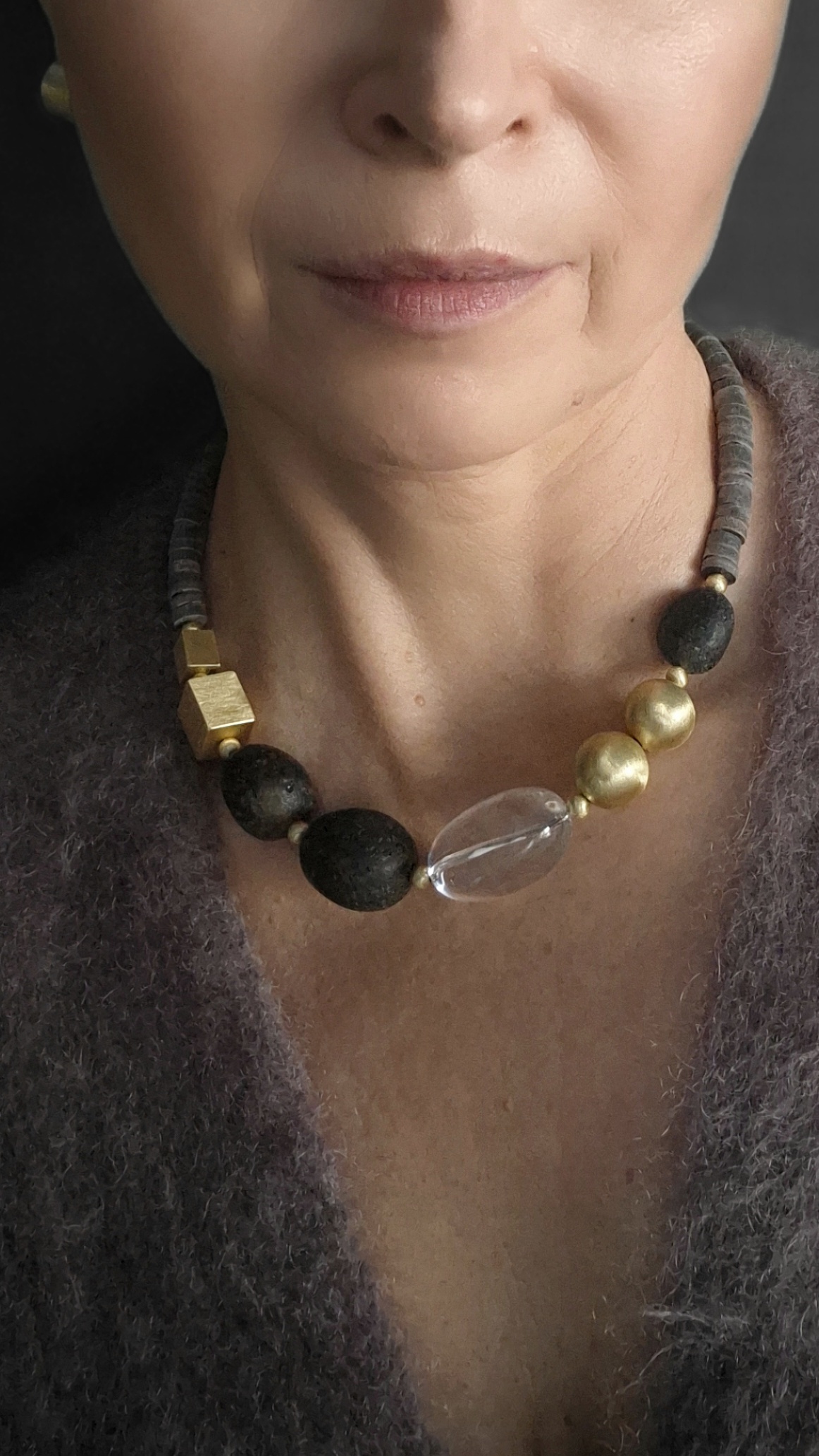 Muszla z bursztynem i kryształem to naszyjnik dla kobiet, które lubią biżuterię z wyraźnym „materiałem” – taką, gdzie faktura i naturalna nieregularność są częścią projektu. Szara, surowa muszla buduje tło, matowy bursztyn w niemal czarnym odcieniu dodaje głębi, a kryształ górski wyszlifowany na gładko wnosi czystość i światło. Ten kontrast działa świetnie w prostych stylizacjach: im mniej wzoru w ubraniu, tym lepiej widać charakter naszyjnika.