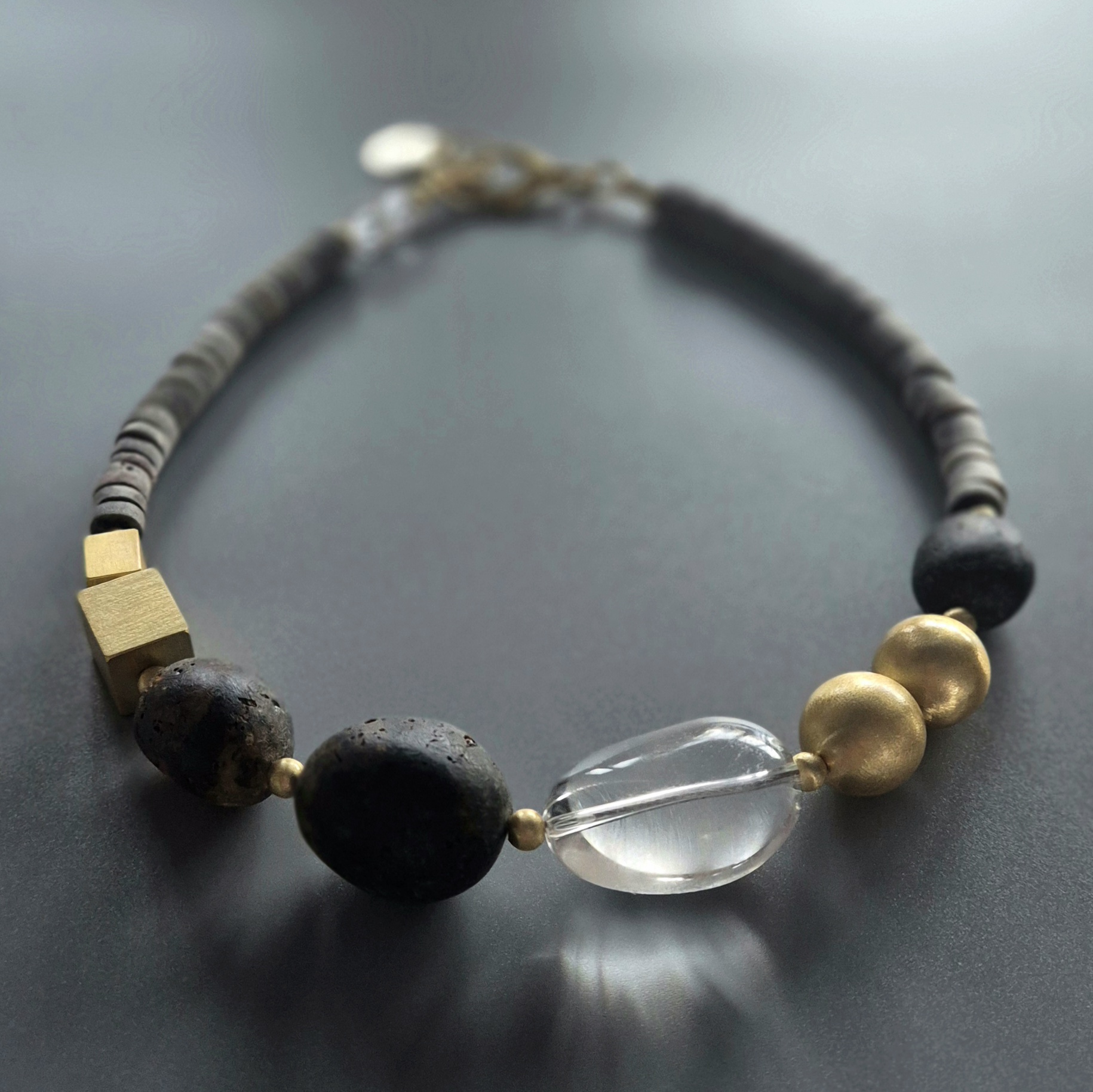 Muszla z bursztynem i kryształem wykonany jest ręcznie ze srebra próby 925 oraz naturalnych materiałów: surowej muszli, surowego bursztynu i kryształu górskiego wyszlifowanego na gładko. Przezroczysty kryształ pięknie odbija światło, matowy, prawie czarny bursztyn dodaje głębi, a szara muszla podkreśla surowy, nowoczesny charakter. Ze względu na specyfikę naturalnych elementów każdy egzemplarz może się nieznacznie różnić.