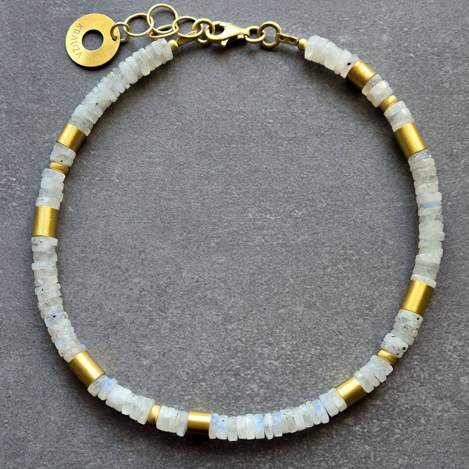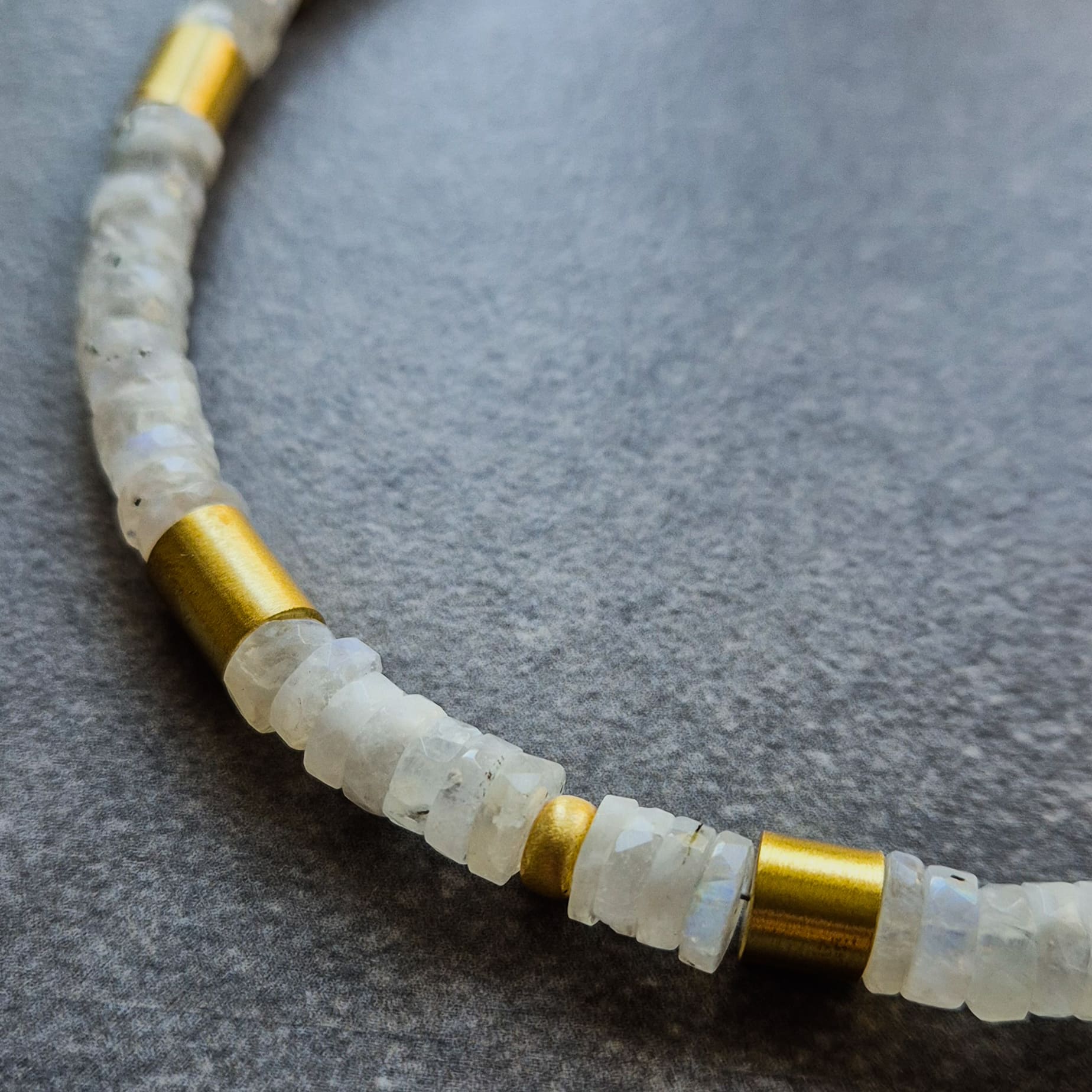 Ten krótki naszyjnik z kamieni księżycowych zachwyca subtelnym blaskiem i elegancką formą. Biało-przezroczyste kamienie o charakterystycznym, opalizującym połysku (efekt adularescencji) zostały przeplecione złotymi detalami ze srebra najwyższej próby, chronionego nowoczesną, złotą powłoką, aby długo zachowały swój blask. To biżuteria wysokiej jakości, stworzona z myślą o kobietach kochających naturalne piękno i wyrafinowany styl.