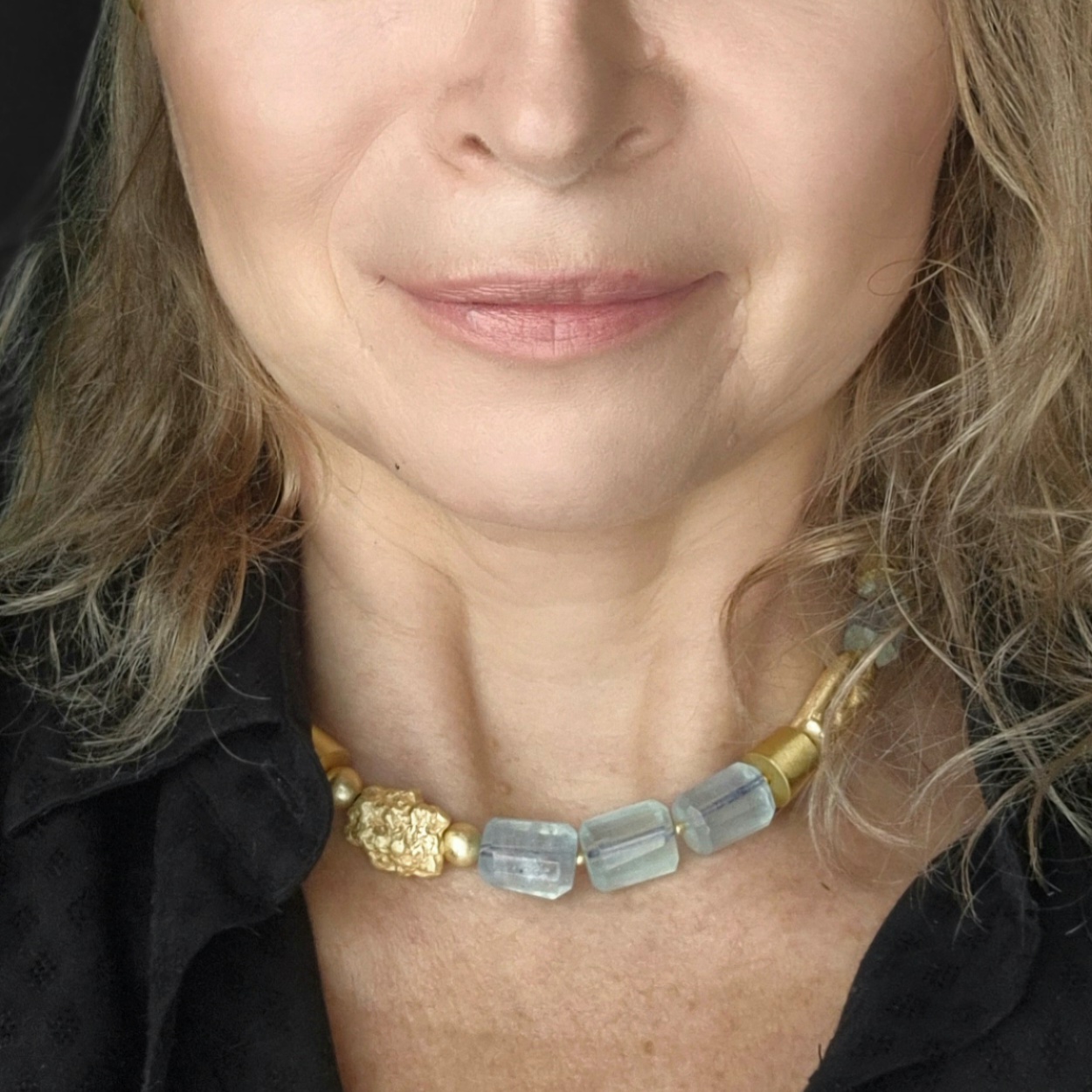 Naszyjnik z akwamarynem i złotymi elementami to elegancka, wyrazista biżuteria z kamieni naturalnych dla kobiet, które lubią czuć na sobie „prawdziwy” kamień. Duże, nieregularne akwamaryny tworzą spektakularną linię przy dekolcie, a złote bryłki, walce i kulki ze srebra w złotej powłoce nadają całości nowoczesny, rzeźbiarski charakter.