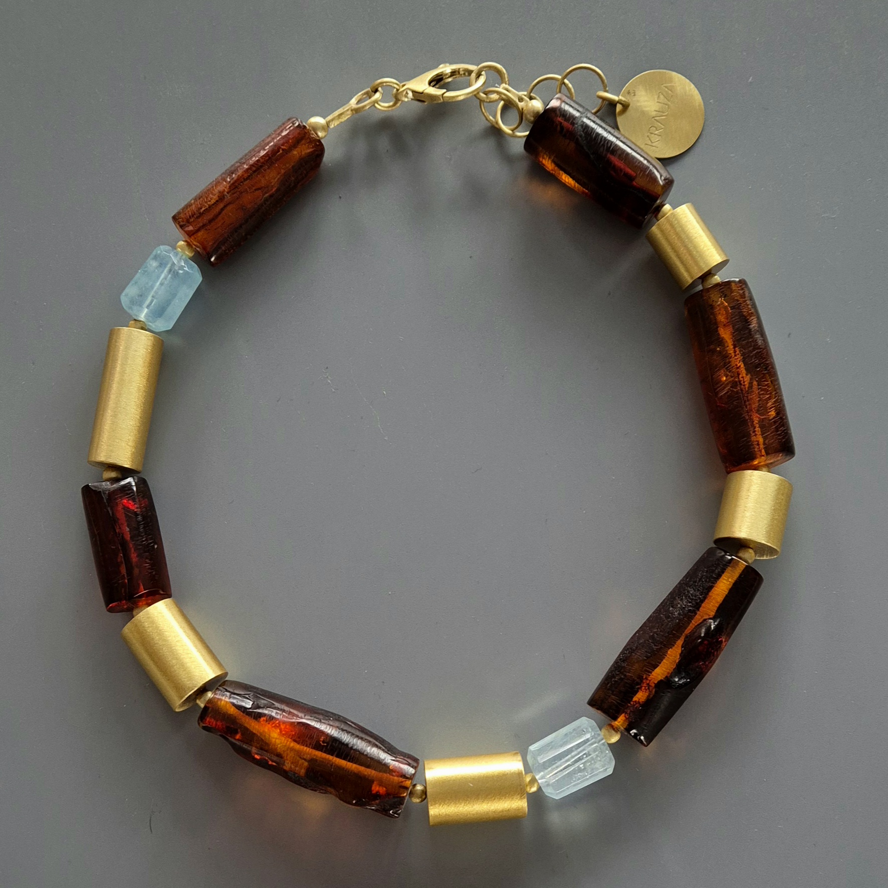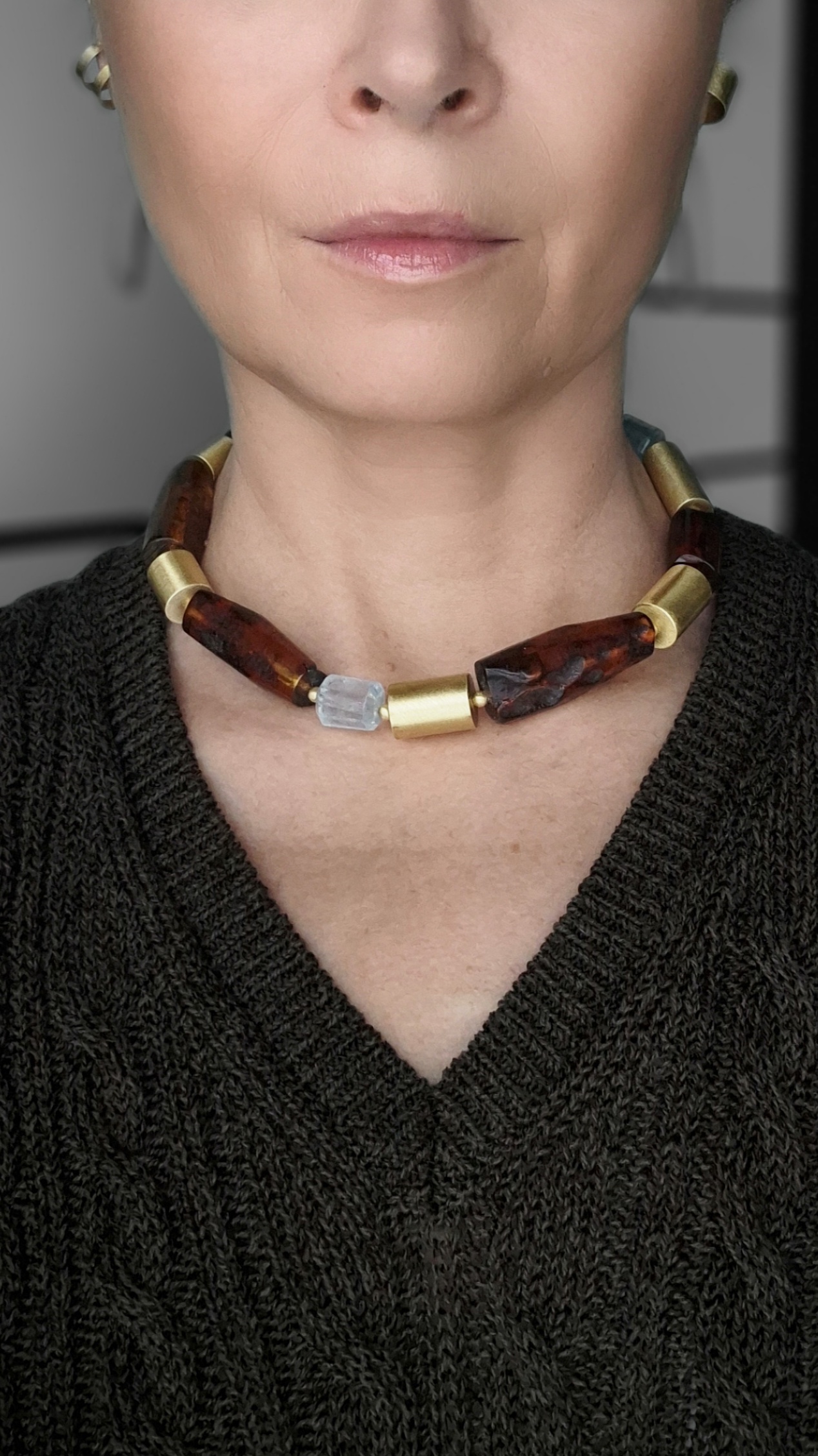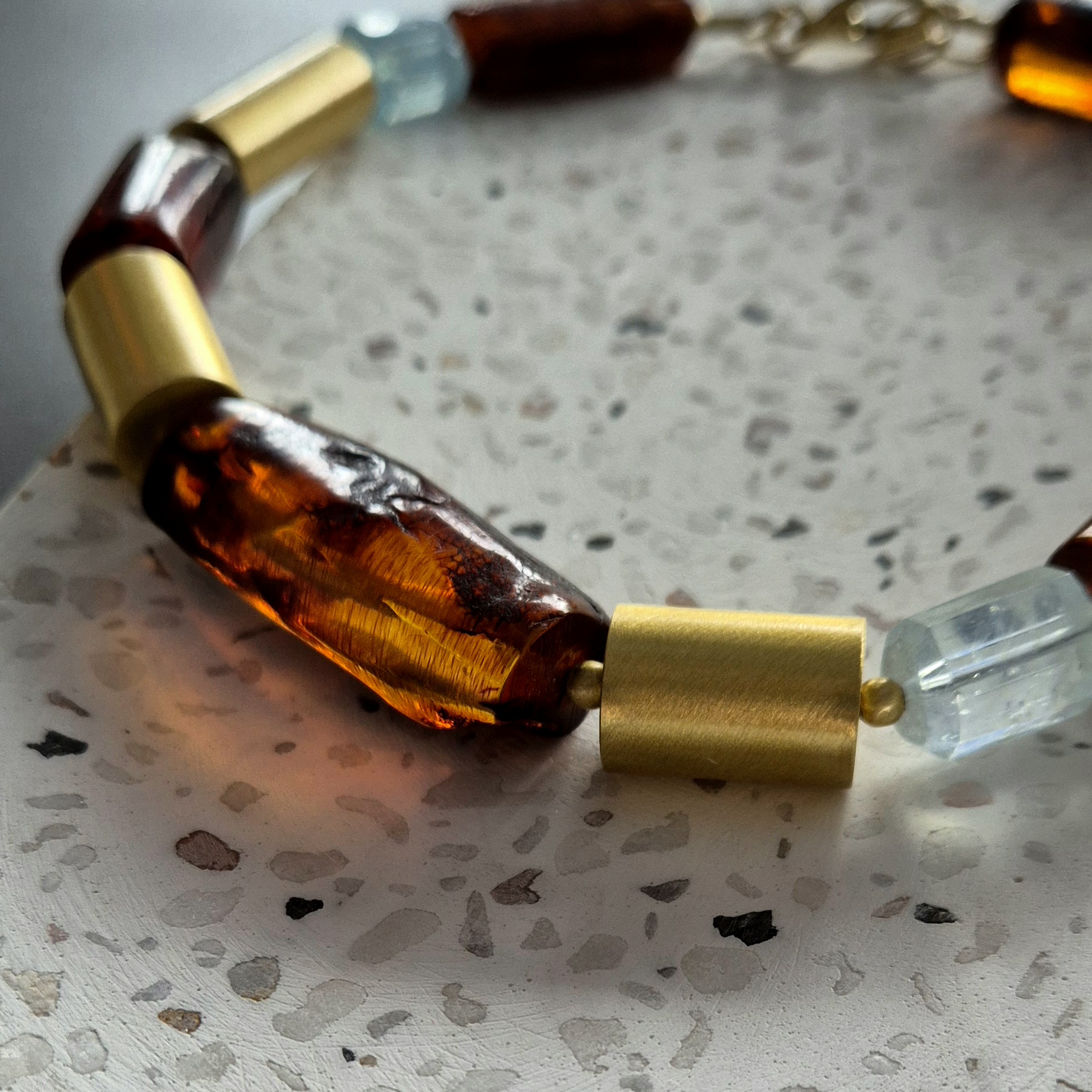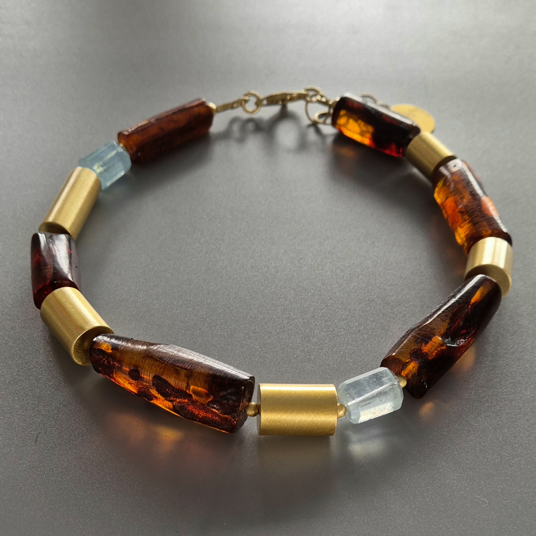 Naszyjnik z bursztynami i akwamarynem to autorska kompozycja dla kobiet, które lubią połączenie ciepłych i chłodnych tonów w jednym dodatku. Walcowe bursztyny w kolorze koniaku z widocznymi inkluzjami tworzą szlachetną, rozgrzaną linię przy dekolcie, a dwa akwamaryny wprowadzają oddech – chłodny błękit, który balansuje całość.