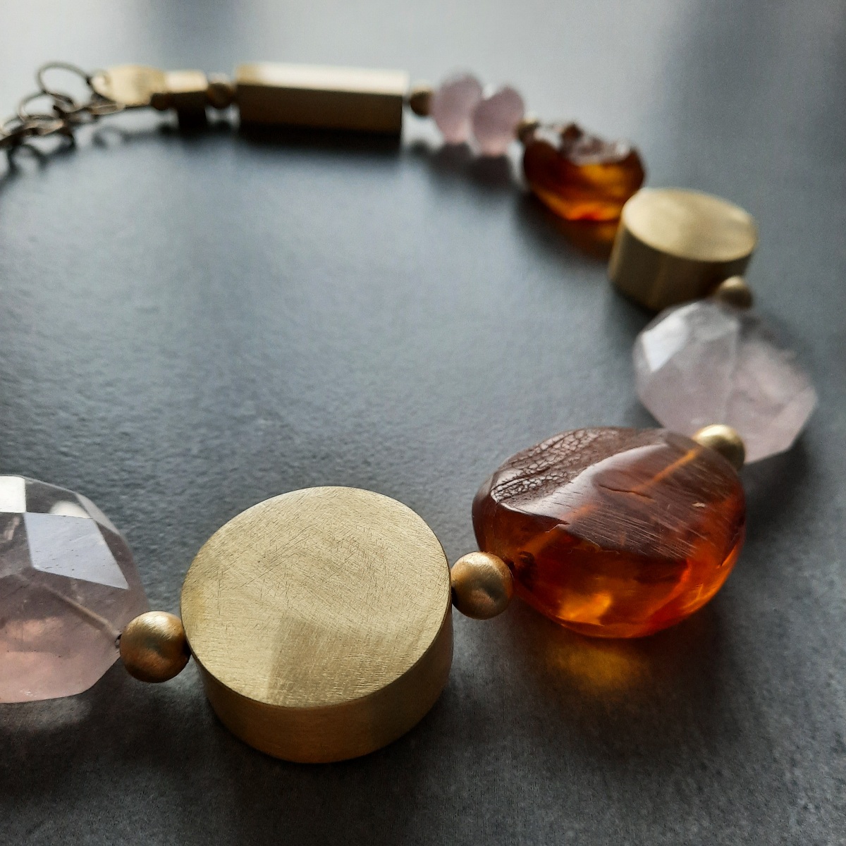 Naszyjnik z bursztynem i różowym kwarcem. Asymetryczny, intrygujący, po prostu piękny.