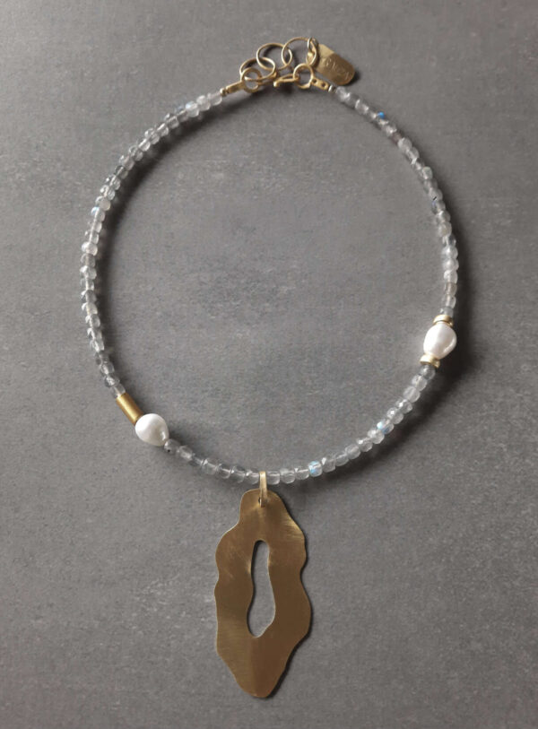 Naszyjnik z dużą zawieszką, pięknymi labradorytami oraz dużymi perłami. Z peewnością będzie przyciągał wzrok.