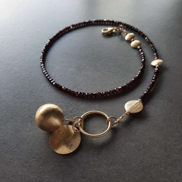 Naszyjnik z granatami i kulą zapinany z przodu zachwyci Cię pięknem i szlifem kamieni oraz nietuzinkową formą. Noś go w zestawie z chokerami oraz łańcuchami i łańcuszkami.