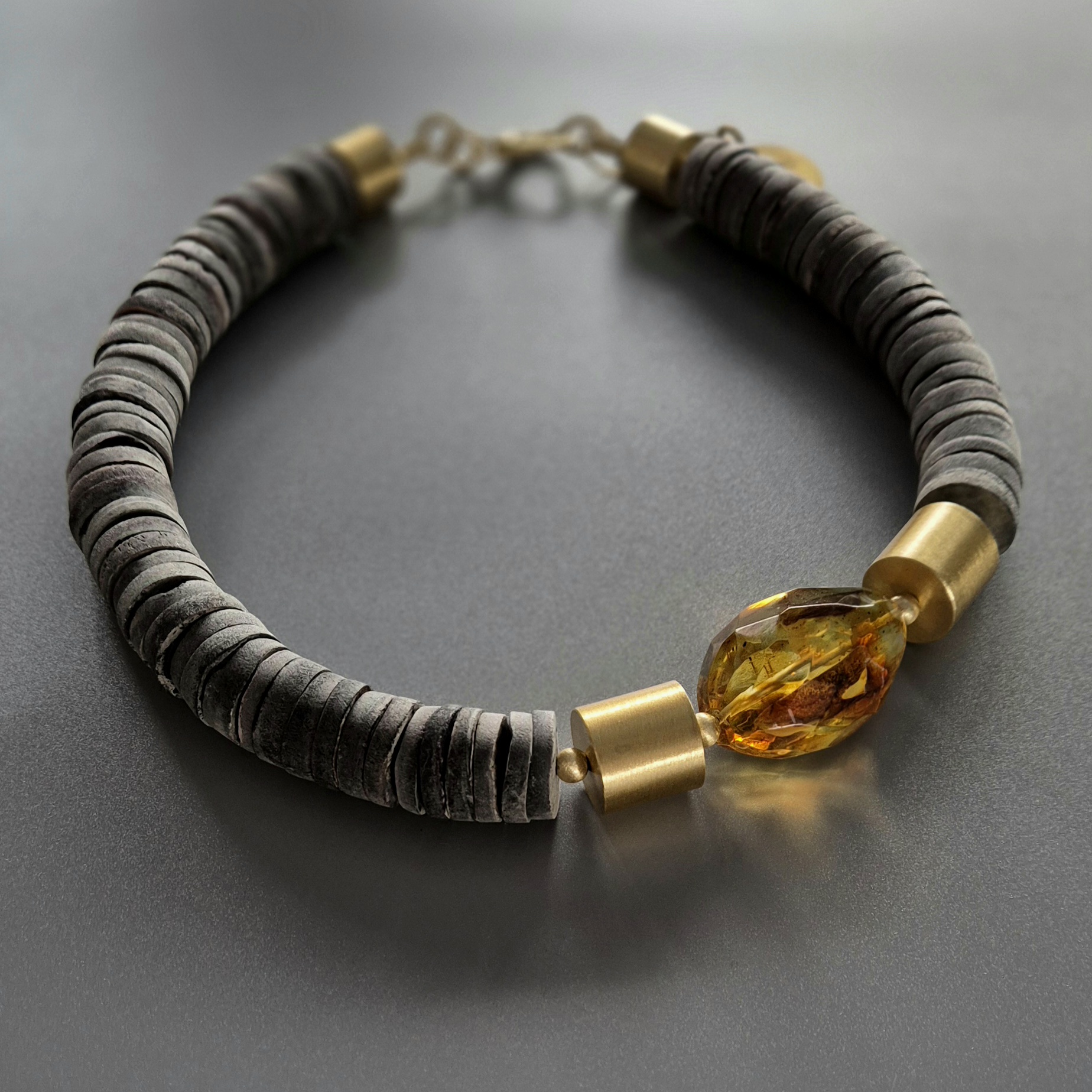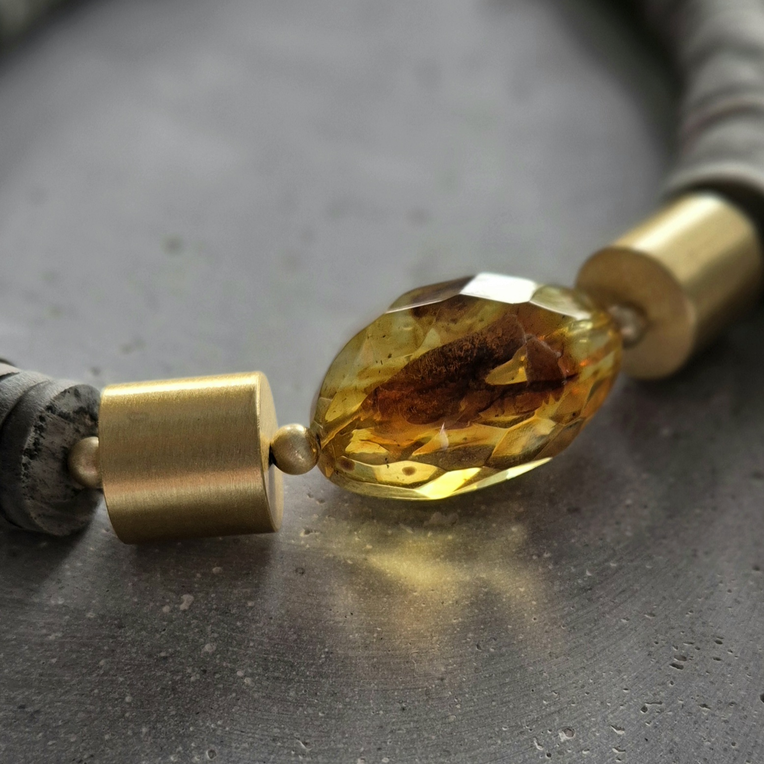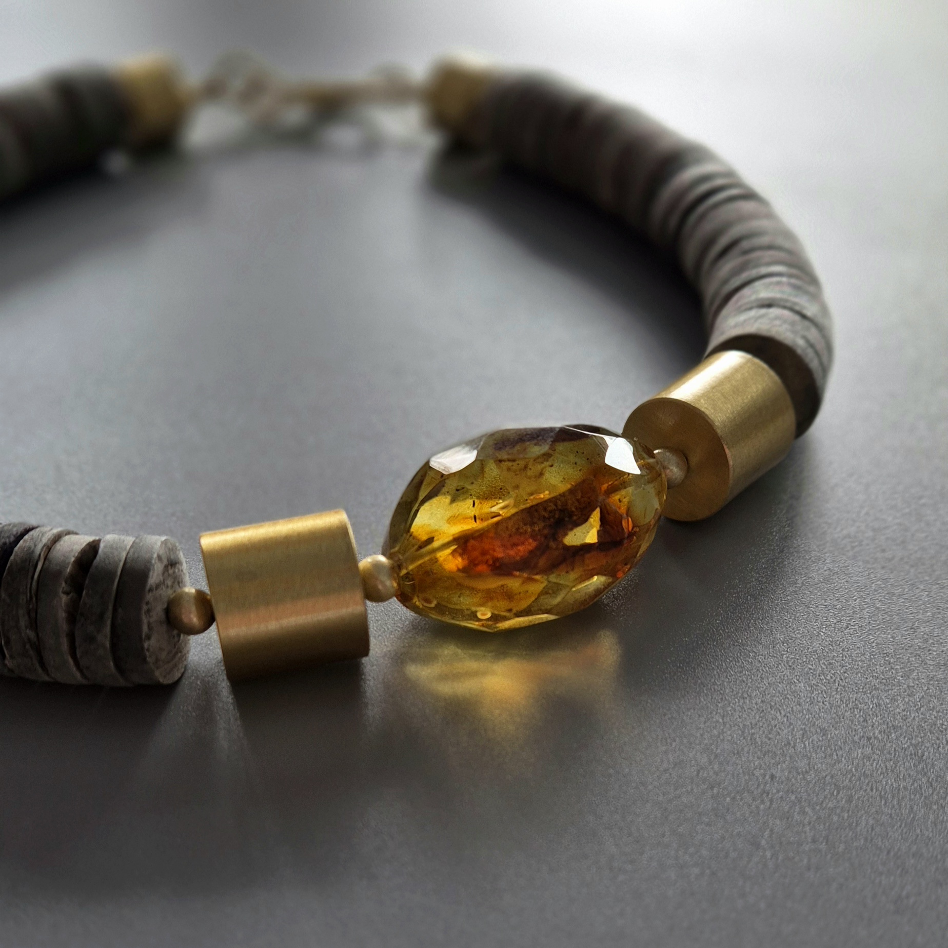 kamienie i materiały: fasetowany bursztyn, surowa muszla, złote walce ze srebra pokrytego powłoką polimerową