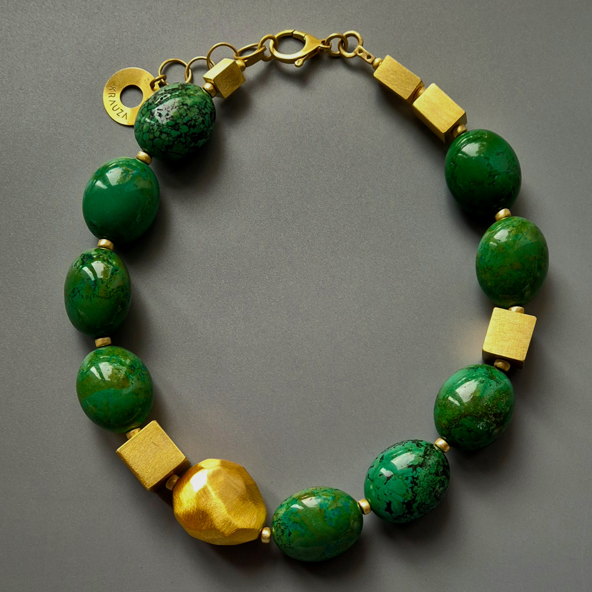 Ten naszyjnik z turkusu to biżuteria, która emanuje siłą i spokojem jednocześnie. Duże, naturalne kamienie o głębokiej, szmaragdowo-zielonej barwie tworzą rytmiczną kompozycję, przywodzącą na myśl fakturę egzotycznej skóry i tajemnicę natury. Każdy turkus ma własne wzory i niuanse koloru, dzięki czemu nie ma dwóch takich samych egzemplarzy. Całość dopełnia masywna bryła srebra próby 925 w odcieniu złota, która dodaje naszyjnikowi rzeźbiarskiego charakteru i eleganckiego połysku. To biżuteria z osobowością – mocna, magnetyczna i pełna życia.