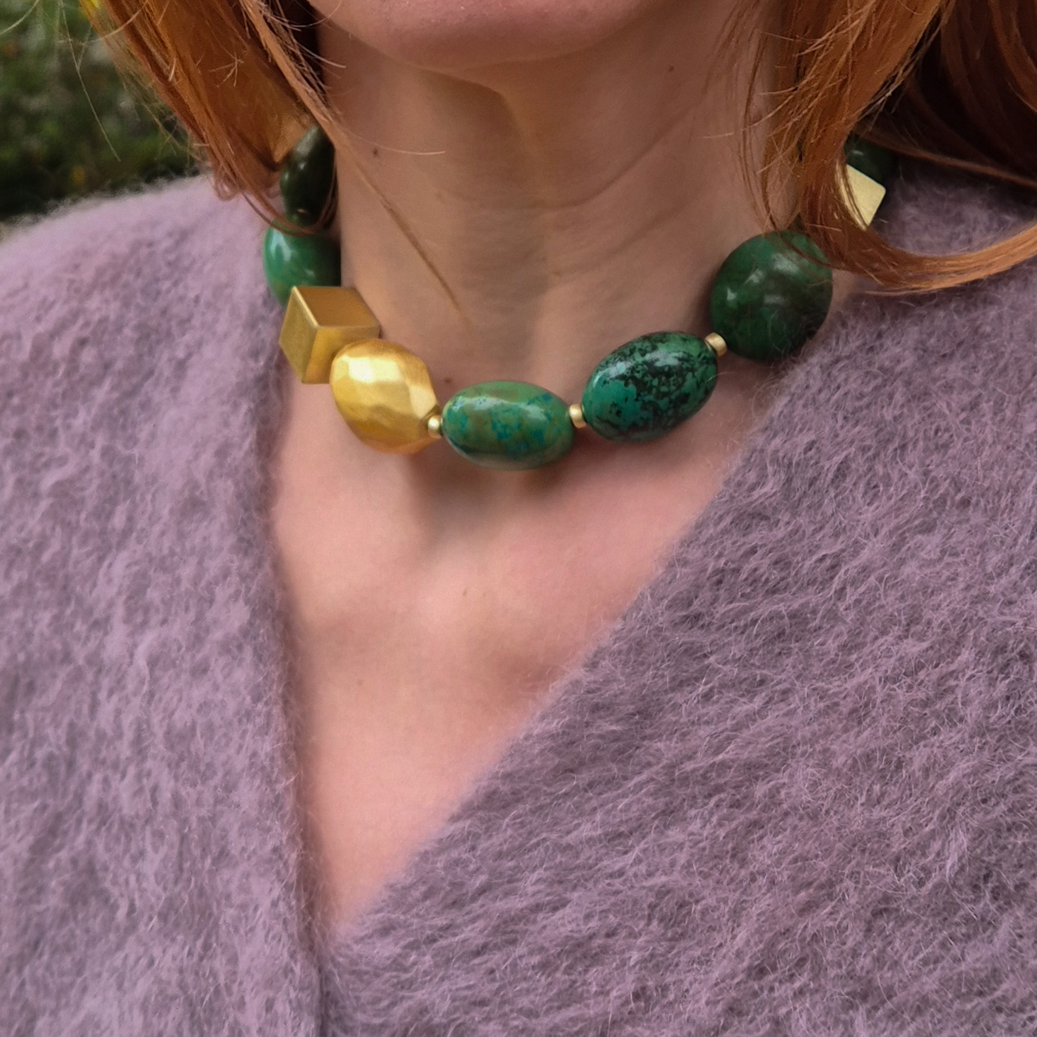 W nadchodzącym sezonie jesień–zima 2025 królują głębokie barwy i naturalne tekstury. Naszyjnik z turkusu harmonizuje z modną paletą ziemistych tonów – w tym z ciepłym brązem Mocha Mousse, kolorem roku Pantone 2025. W duecie z kremowym golfem, burgundową sukienką lub ciemnozielonym płaszczem tworzy efekt luksusowej prostoty. Turkus rozświetla twarz, a złota bryła wprowadza nutę elegancji, która sprawia, że biżuteria staje się nie tylko dodatkiem, lecz elementem stylu – wyraźnym, świadomym, autentycznym.