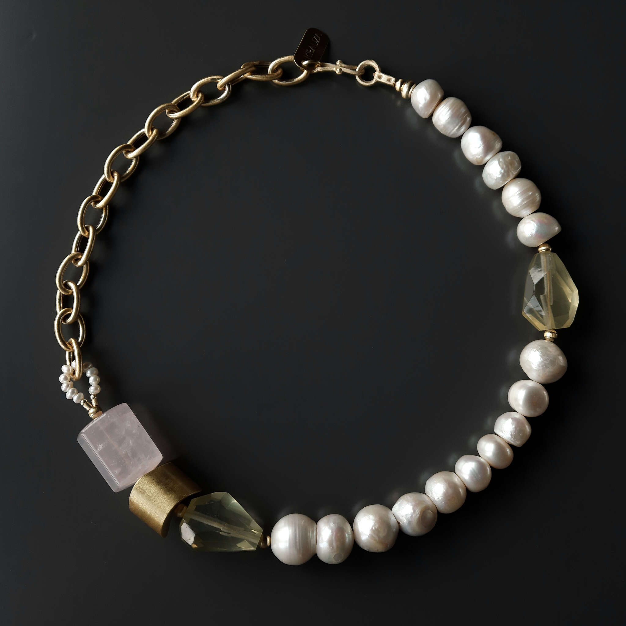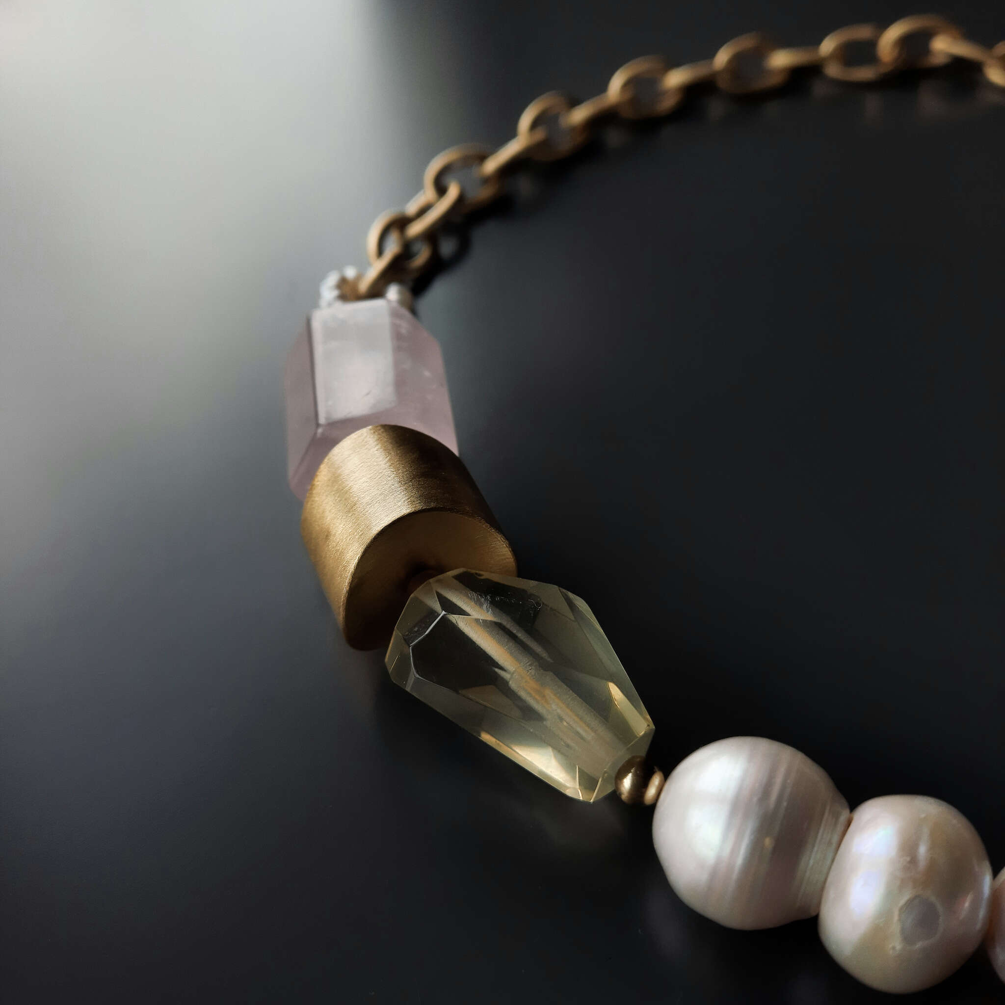 Unikatowy naszyjnik z perłami, kwarcem lemon i kwarcem różowym. Gruby złoty łańcuch dodaje mu nieco nonszalancji.