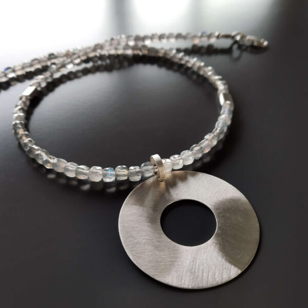 Srebrny naszyjnik kółko z pięknie szlifowanymi labradorytami to model na co dzień. Taka biżuteria urozmaici proste bluzki i t-shirty, a jednocześnie nie będzie przytłaczać. W naszym sklepie znajdziesz również inne naszyjniki kółka.
