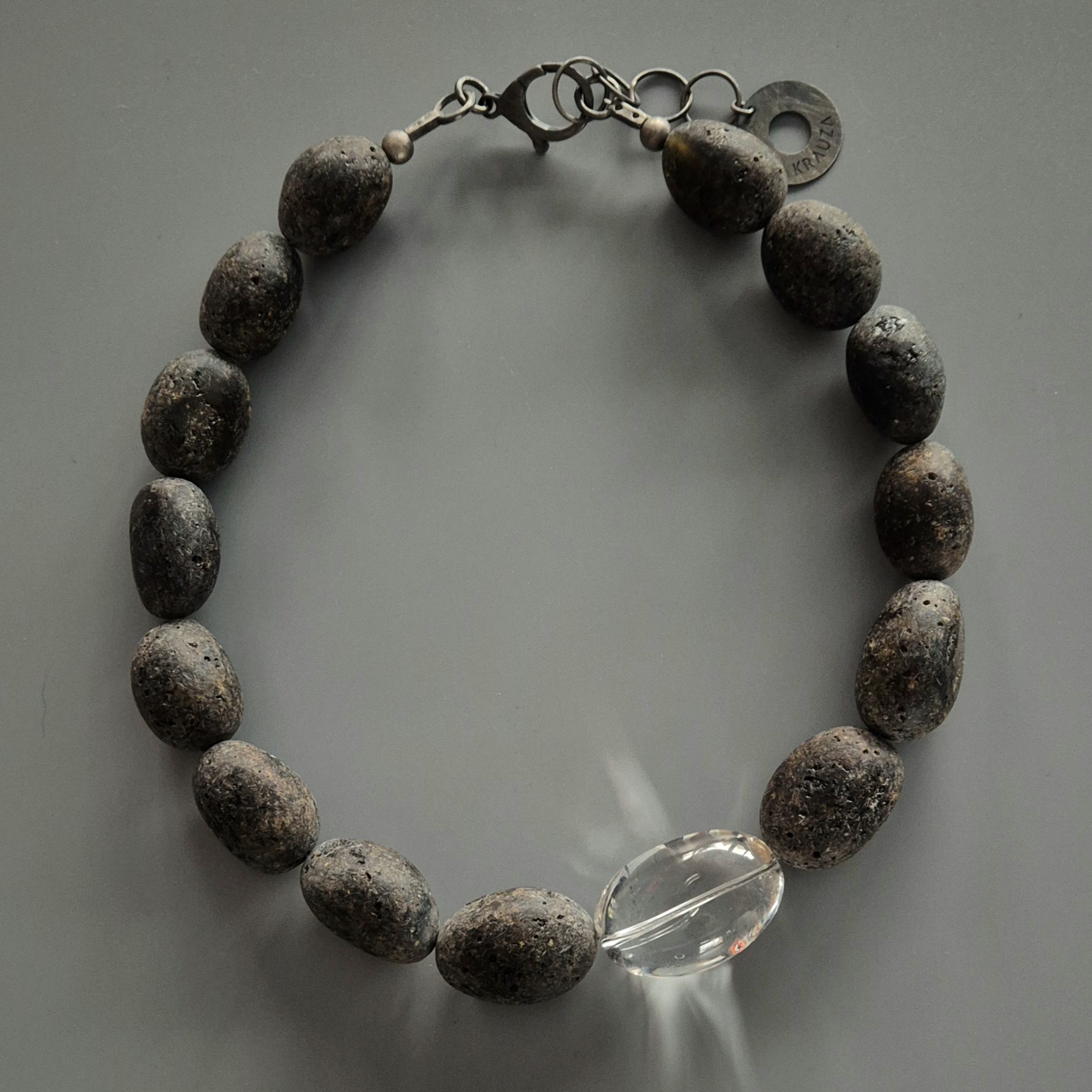 Naszyjnik wykonany jest z srebra próby 925 wykończonego oksydą oraz naturalnych kamieni – surowego bursztynu i gładko szlifowanego kryształu górskiego. Ponieważ korzystamy wyłącznie z kamieni naturalnych, ich odcień i kształt mogą delikatnie się różnić, co podkreśla unikatowy charakter każdego egzemplarza.