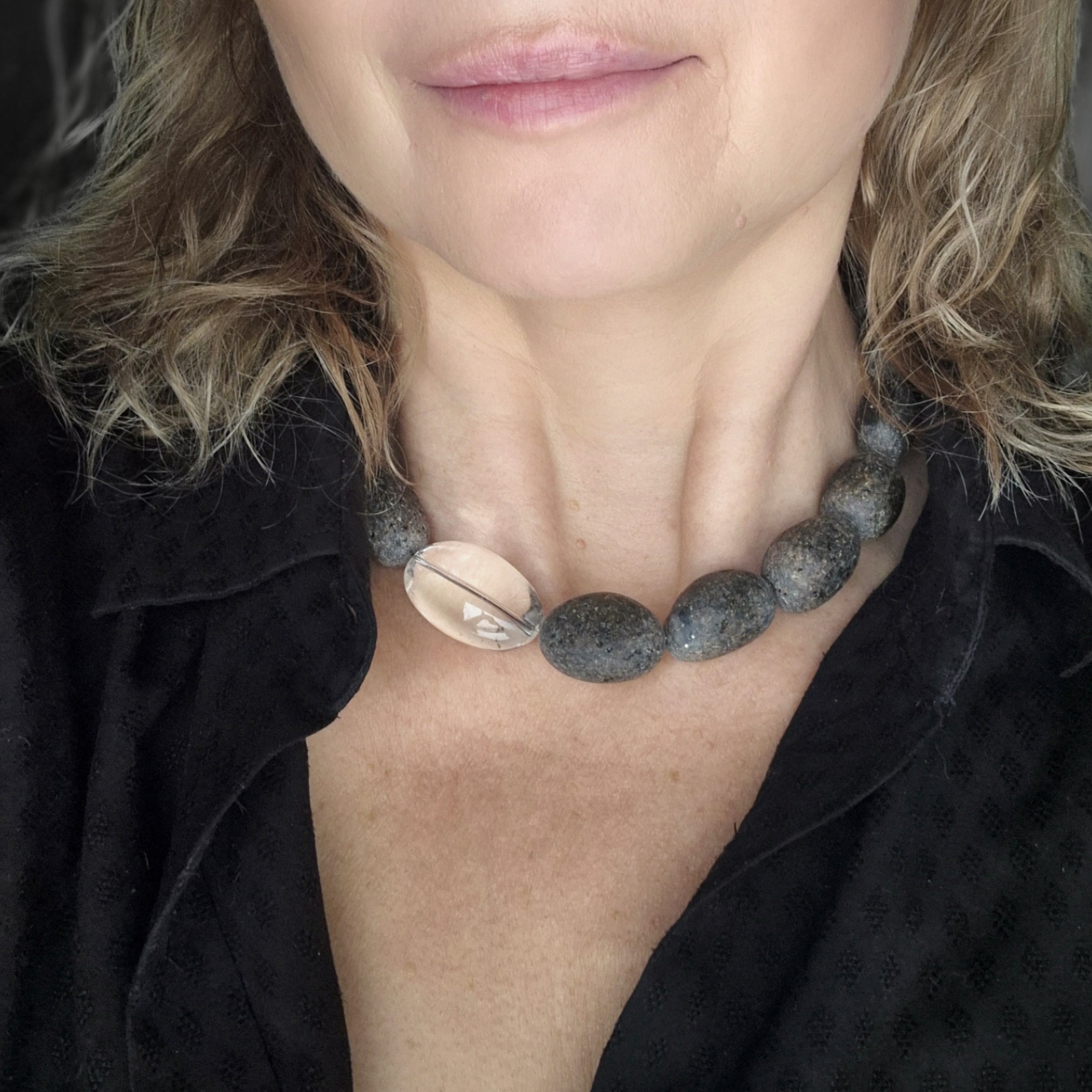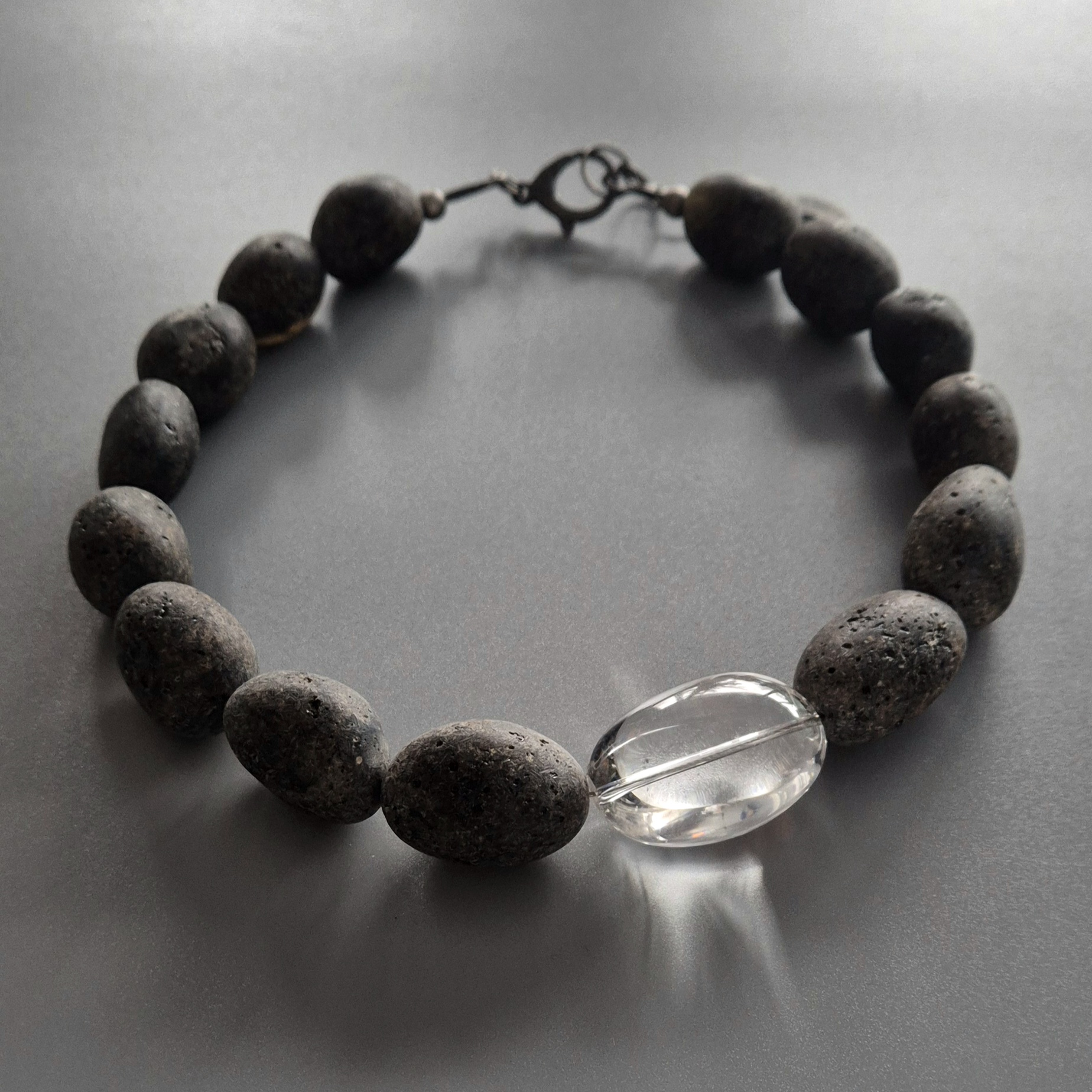 Ziemiste barwy bursztynu połączone z chłodną przejrzystością kryształu oraz oksydowanym srebrem przywodzą na myśl pejzaże natury – piasek, kamień, światło i cień. To naszyjnik, który sprawdzi się zarówno na co dzień jako mocny akcent w minimalistycznych stylizacjach, jak i wieczorem, kiedy chcesz podkreślić swoją indywidualność.