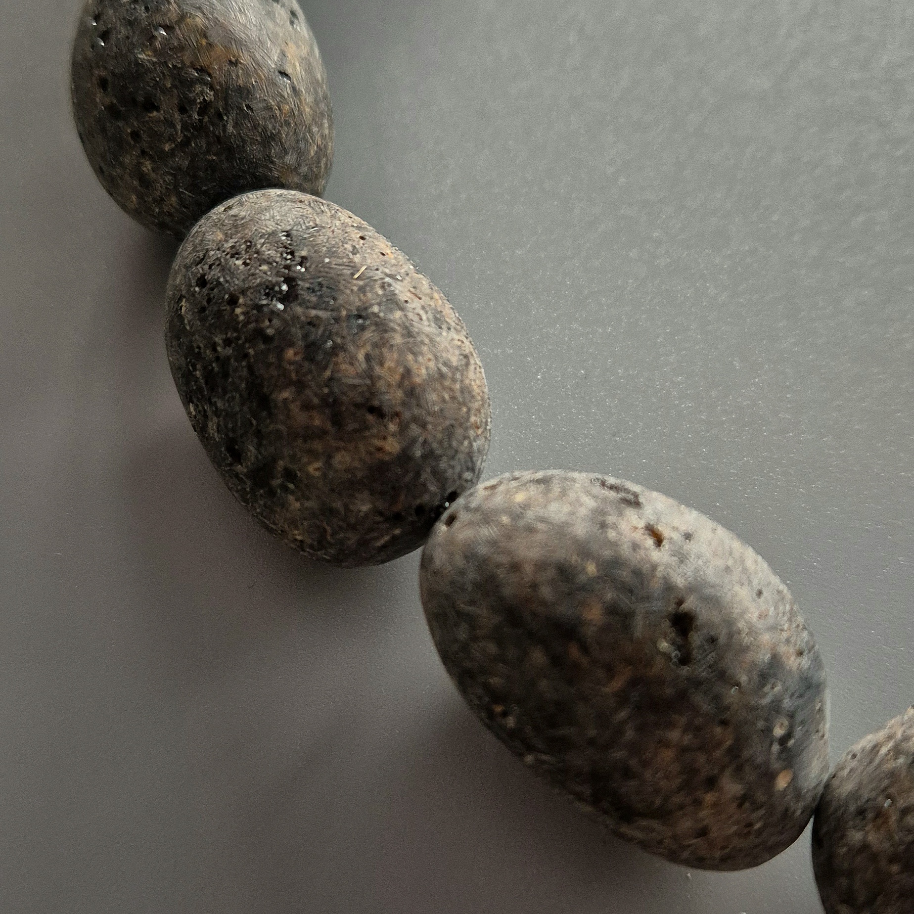 detale: masywne, organiczne formy kamieni, oksydowane srebrne zapięcie, spójna paleta barw,