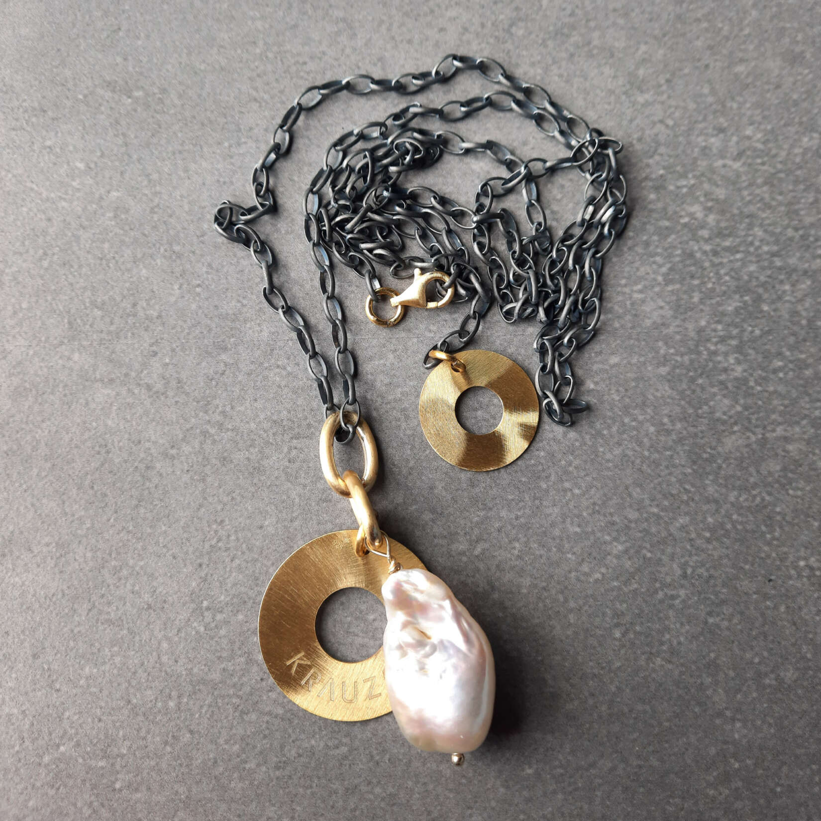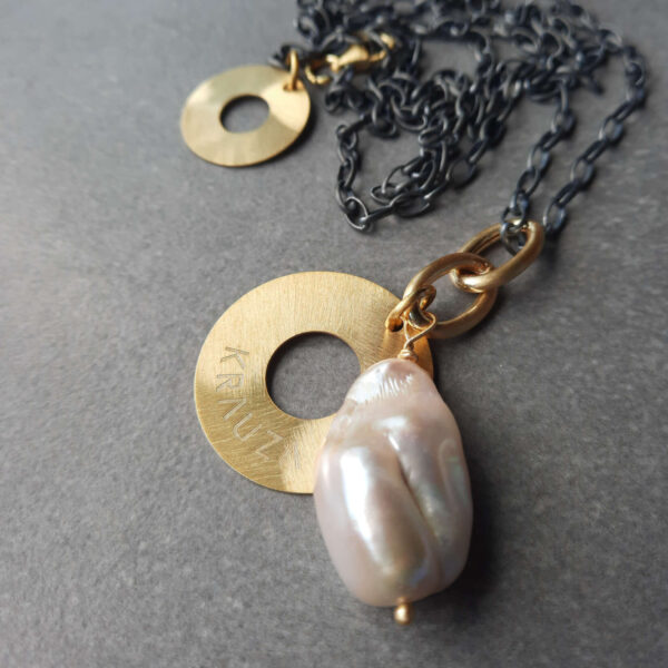 Zawieszka z dużą perłą na długim oksydowanym łańcuchu.